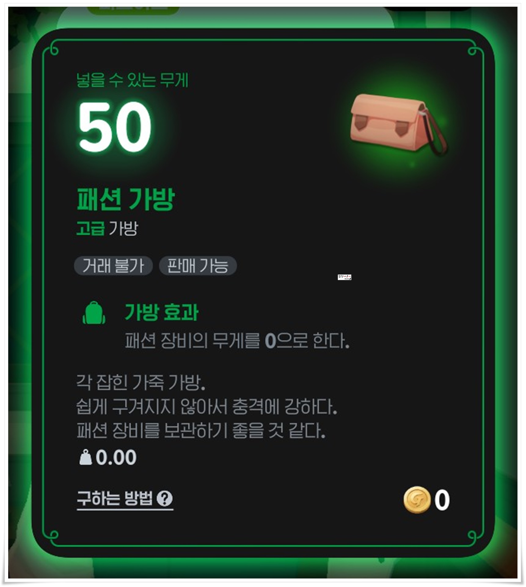 패션가방의 경우에는 패션장비의 무게를 0으로 만들어 주는 효과가 있으며 하트토큰의 누적사용량이 190개를 넘어야 구매가 가능했습니다.