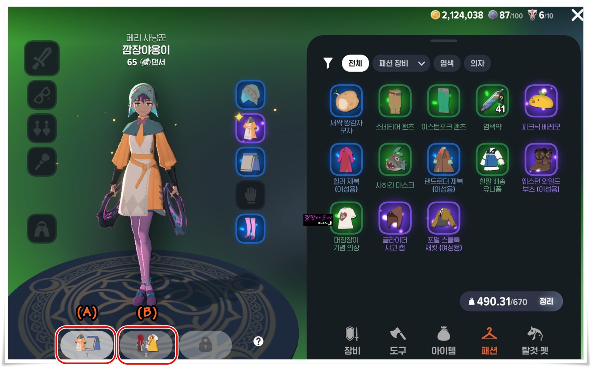 만약 (A)라는 곳에 최고 등급의 아이템으로 무장을 하셨다면 이제 (B)에 등급에 상관 없이 제일 예쁜 아이템을 이용해 캐릭터를 꾸며주세요.