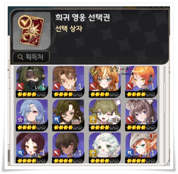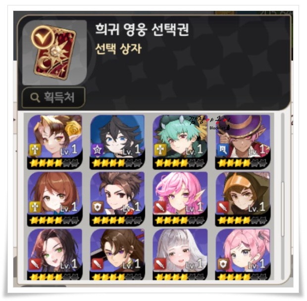 4성급 34명의 캐릭터 중 하나를 획득 하실 수 있고 모든 희귀영웅에 대한 뽑기확률은 2.9412%로 동일합니다. 위 초기 쿠폰 등록시 2장의 희귀영웅 뽑기를 하실 수 있으니 좋은 캐릭터 뽑으시길 바랍니다!