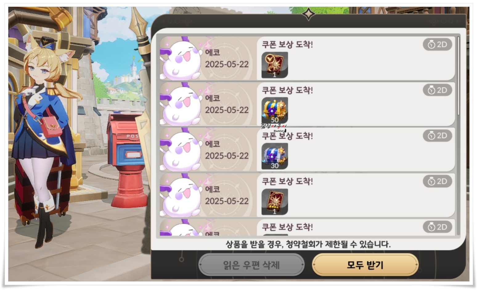 입력한 리딤코드에 대한 선물은 선물함을 통해 받으실 수 있습니다.