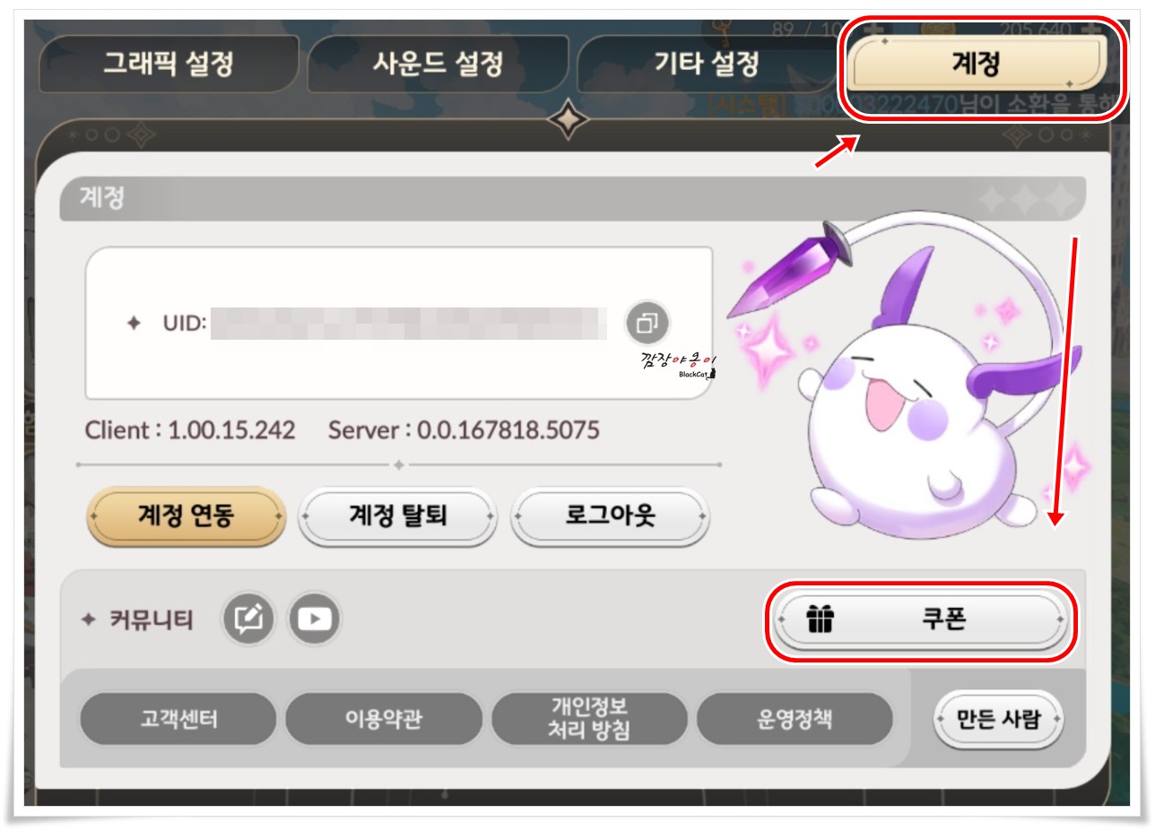 설정에 들어가시면 그래픽 설정/ 사운드 설정/ 기타 설정/ 계정이 있을텐데요. 계정에 보시면 하단에 쿠폰이라는 배너가 있답니다.