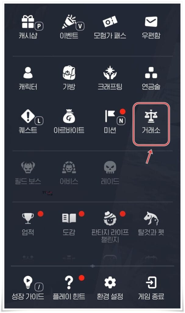가장 손쉬운 방법은 '거래소'를 이용한 구매입니다. '거래소'는 우측 상단 점점점을 누르시면 있습니다.