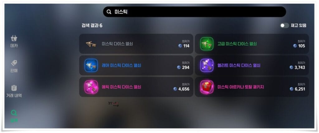 검색창을 통해 다른 유저가 올려둔 아이템을 데카를 이용해 구매할 수 있습니다. 당연히 높은 등급의 열쇠 일수록 거래금액은 높아진답니다.