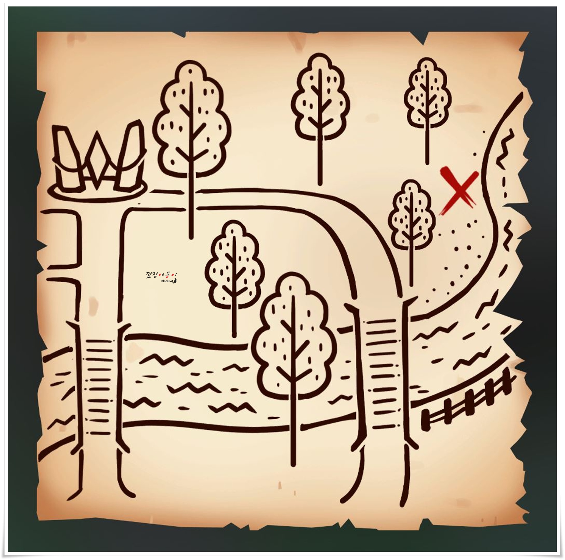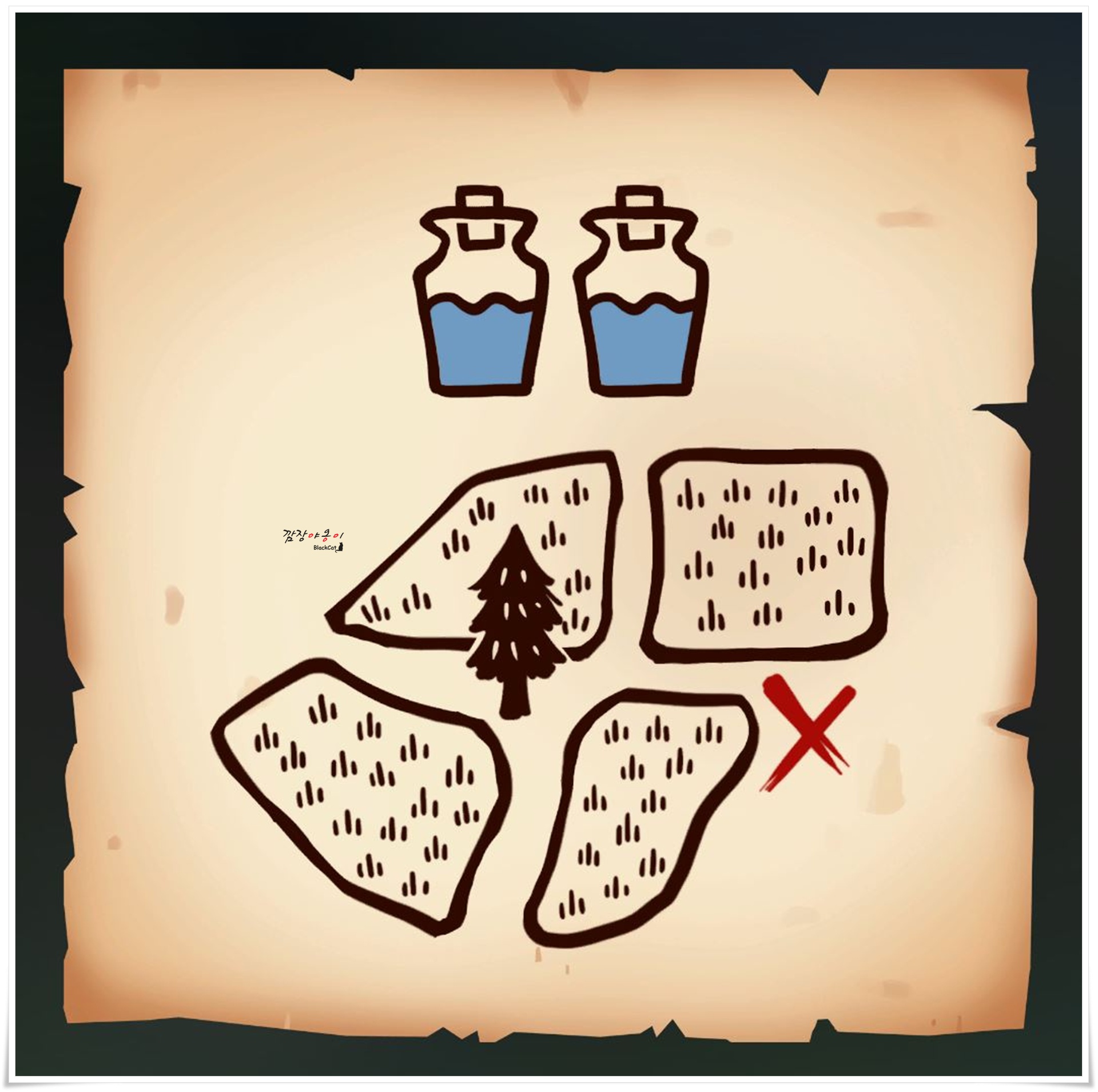 첫번째 단서에는 몇줄의 글귀와 한장의 지도가 그려져 있습니다. 여기서 물병 2개가 필요하다는 것을 확인ㅁ 할 수 있으니 미리 물병을 2개 채워가시거나 최소 빈병 2개를 가져가세요.
