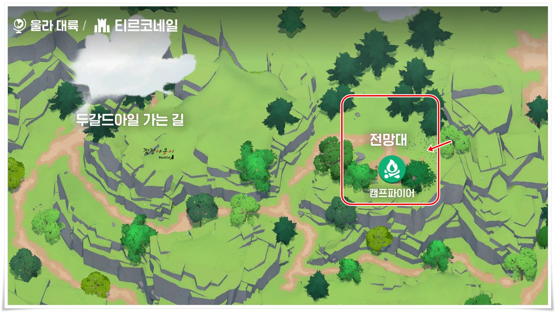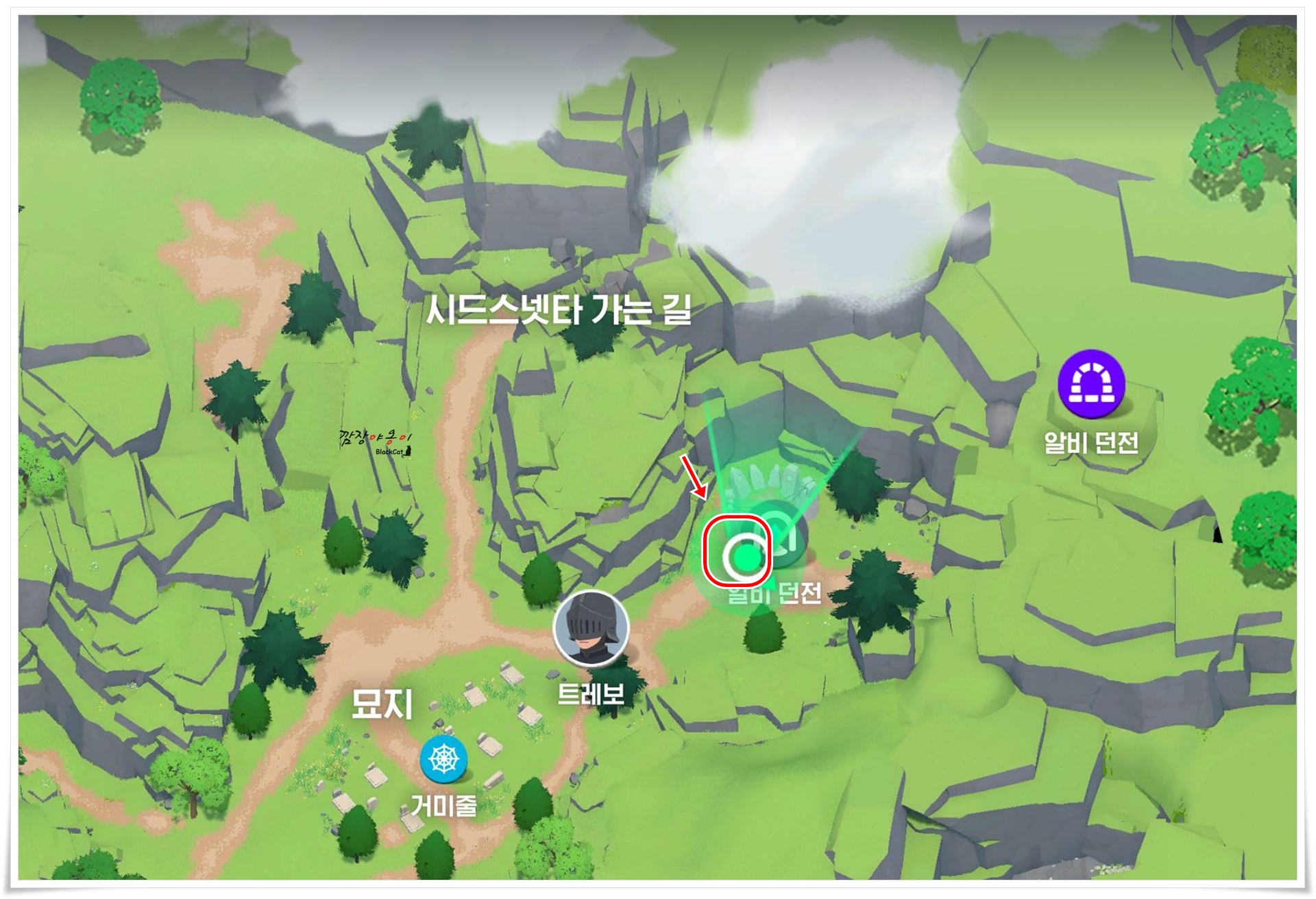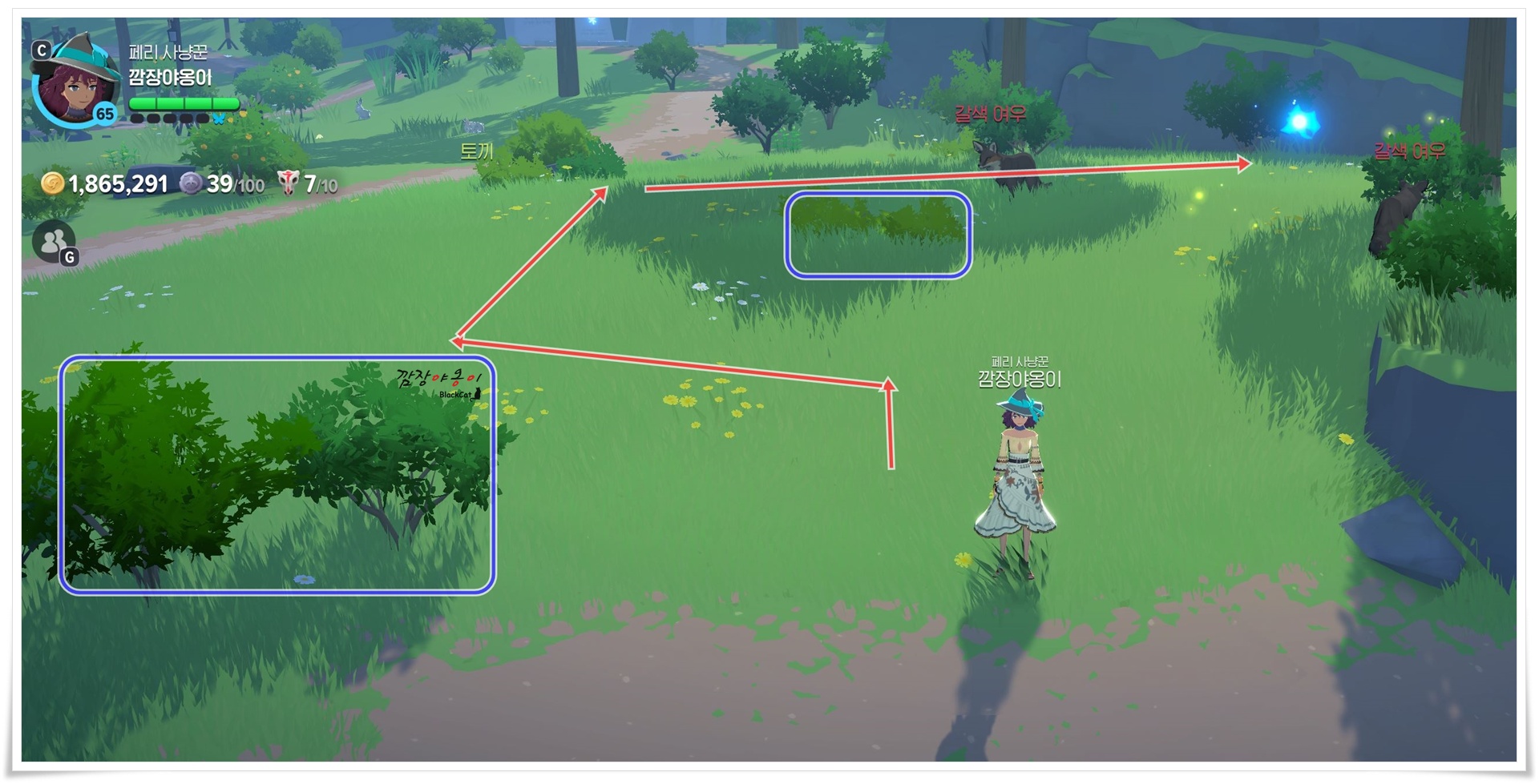 빛기둥과 상호작용 후 움직이는 루트입니다. 파란색 사각형 안에 있는 나무들 사이로 제가 그려둔 길따라 움직이시면 문제 없이 완료하실 수 있답니다.