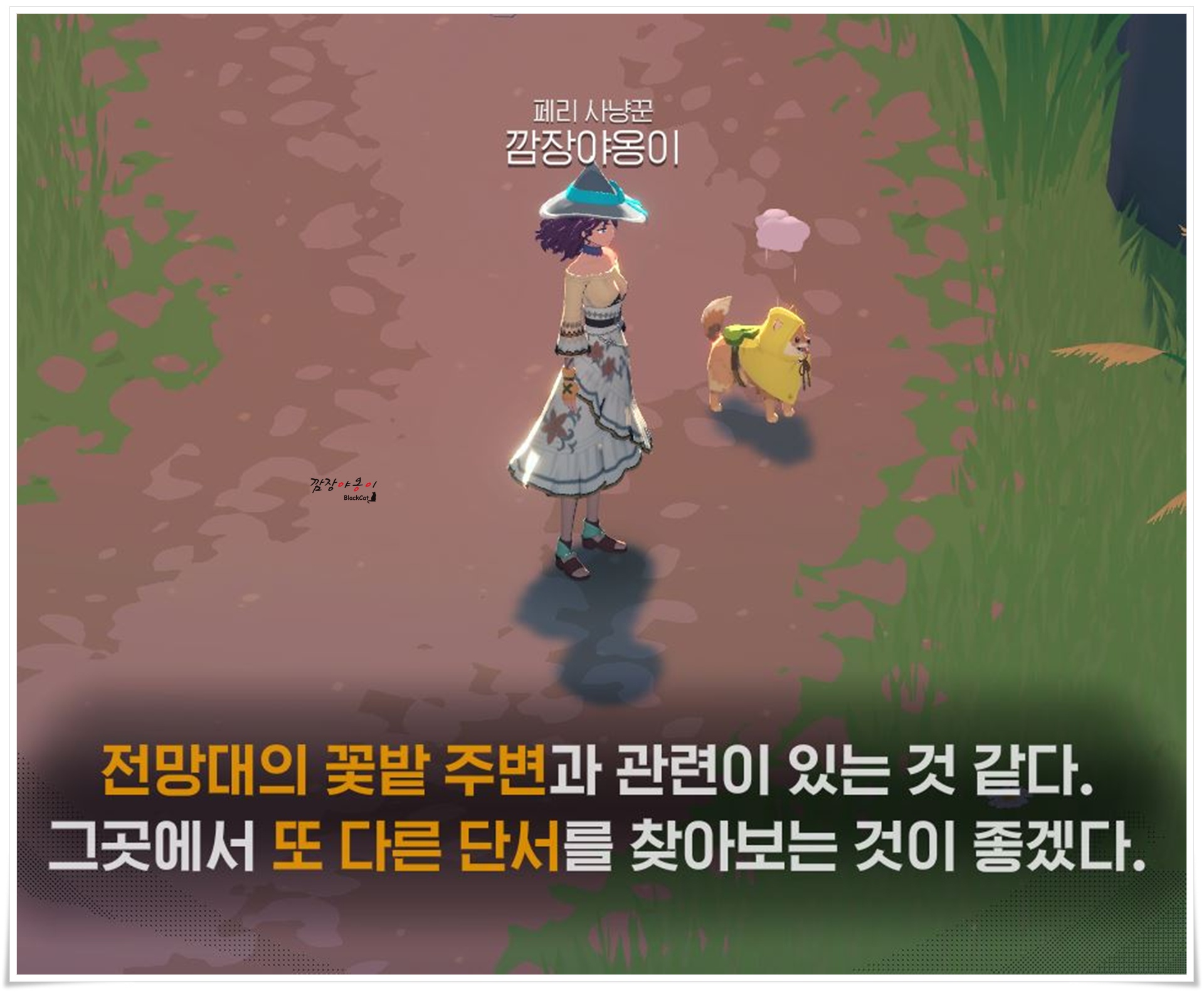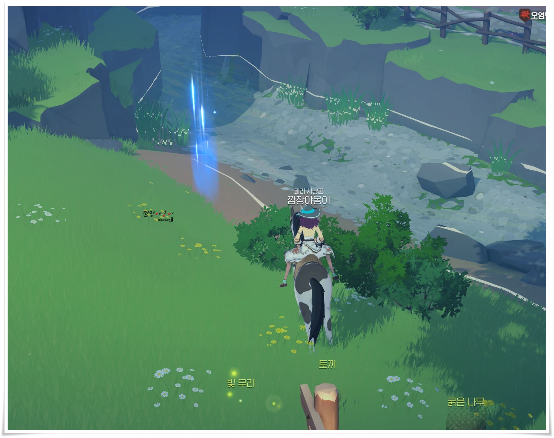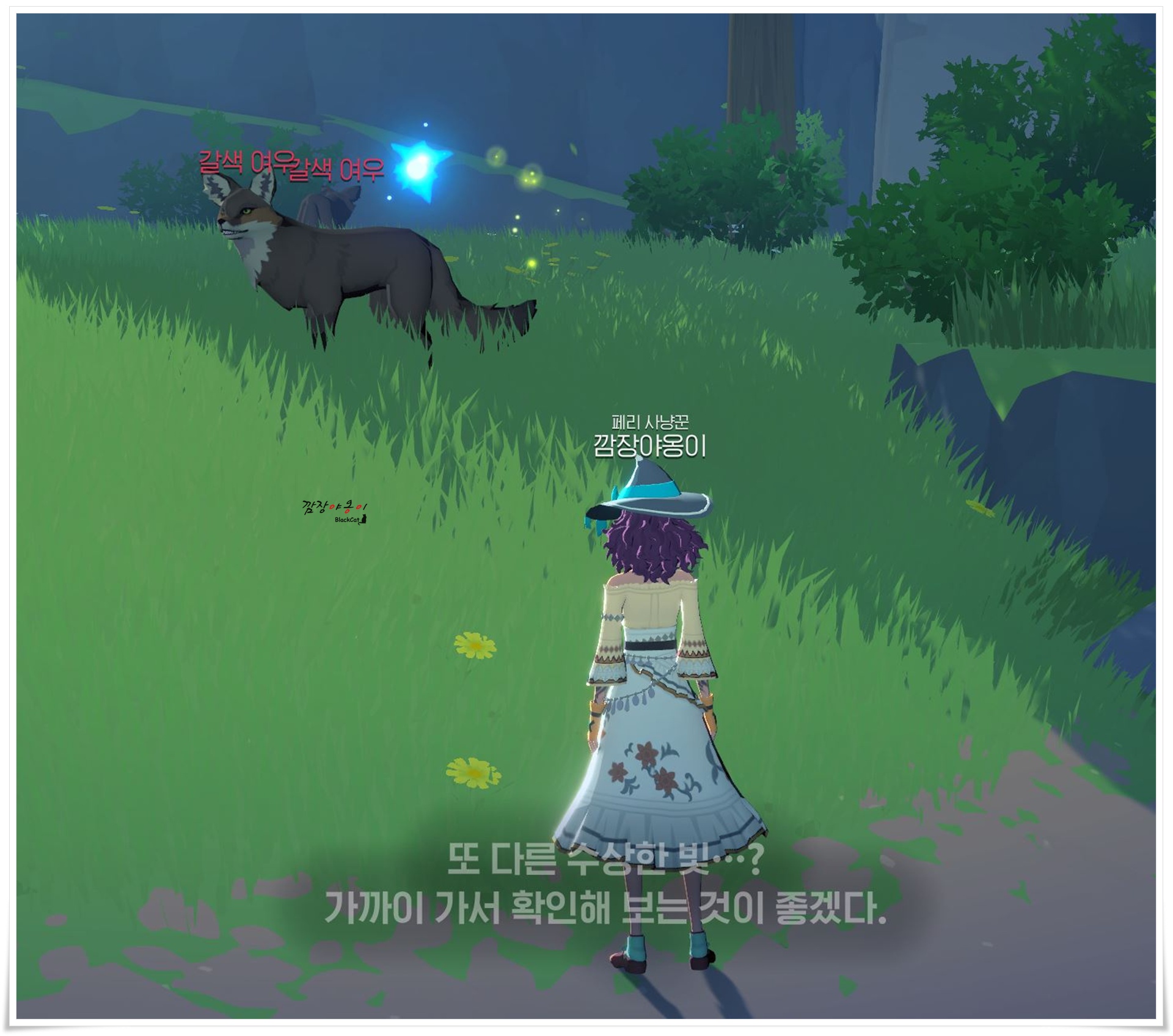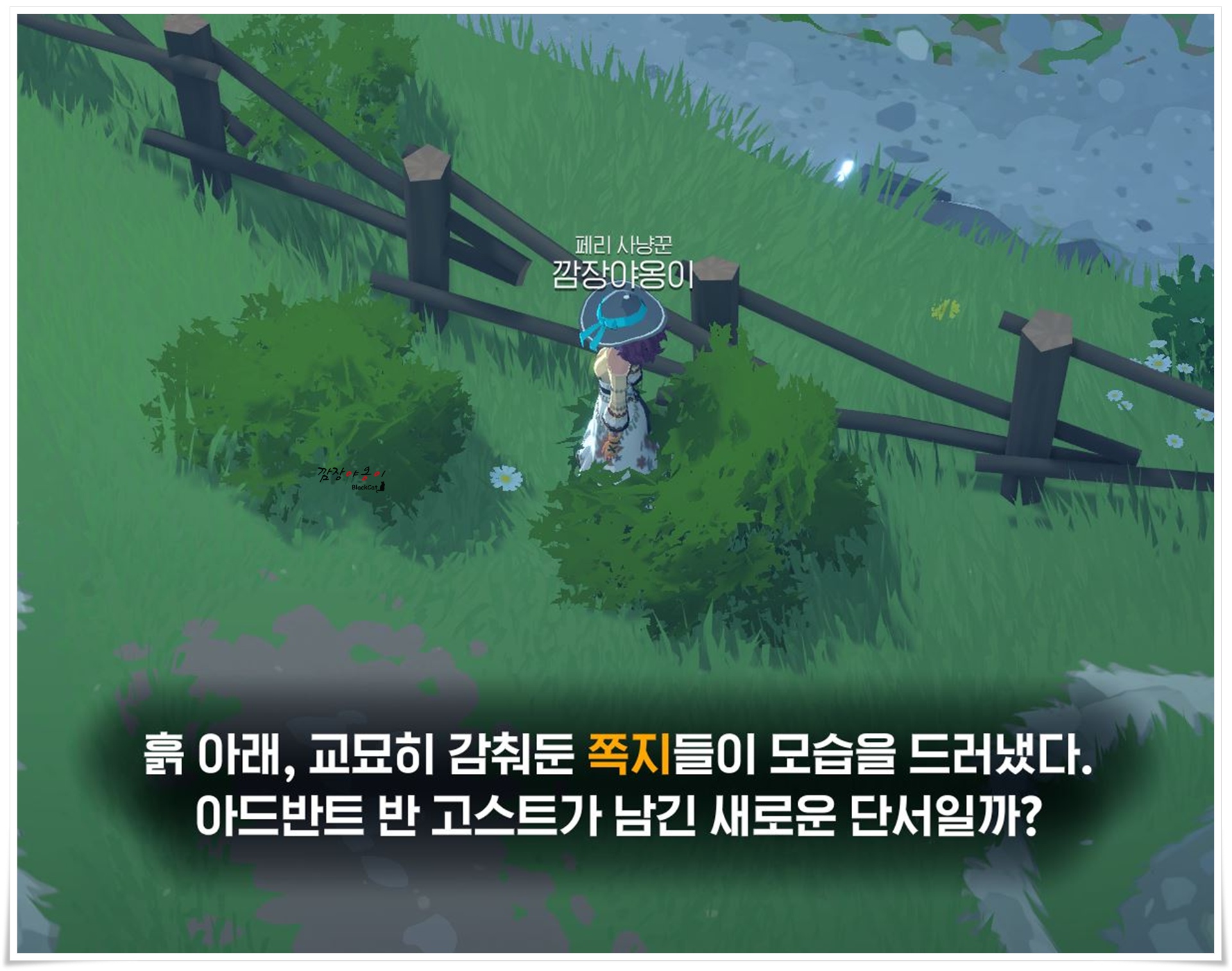 빛기둥과 상호 작용 후 여우 쪽에 있는 푸른 점으로 된 빛으로 가야 하는데요. 얻은 쪽지에 담겨져 있는 내용대로 정해진 루트로 가야만 퀘스트가 완료 됩니다.