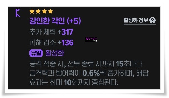 스킬을 사용할 때마다 5초 동안 공격력이 3.5% 증가하며, 해당 효과는 최대 4회까지 중첩된다.