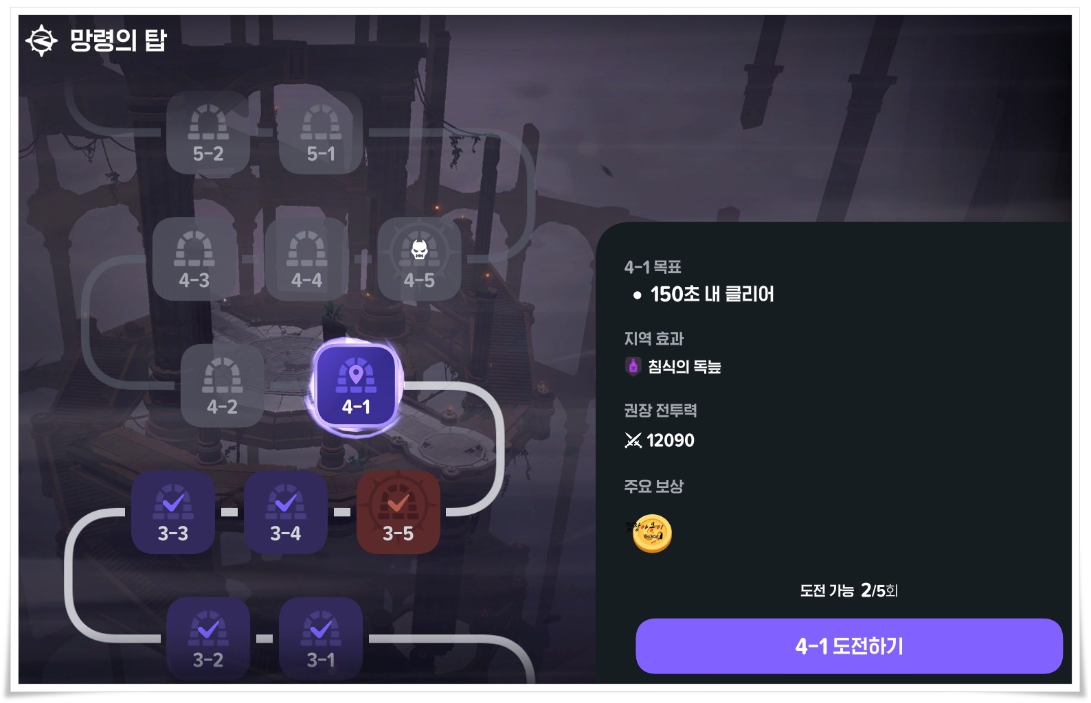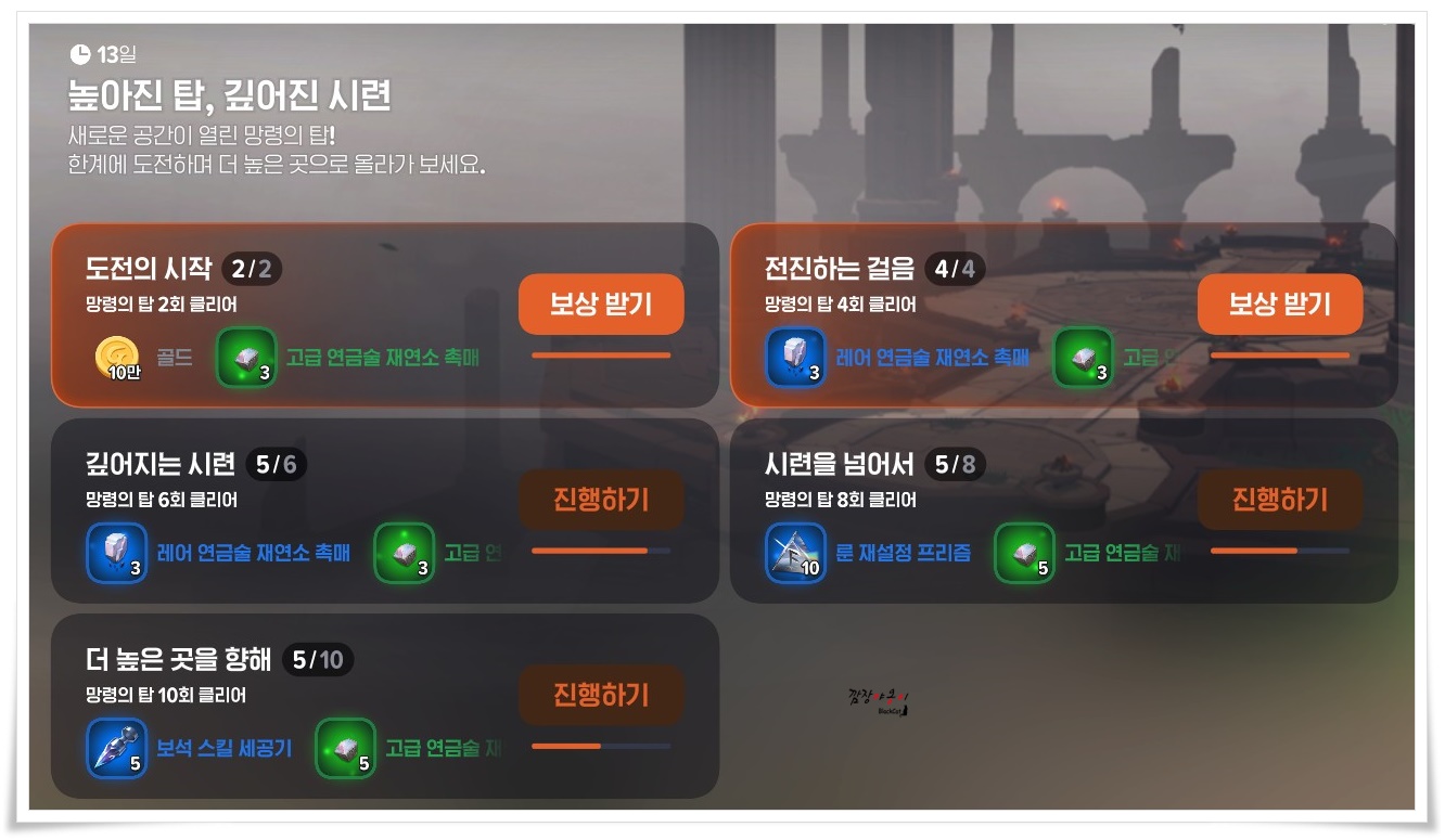 현재 망령의 탑과 관련되어 있는 추가 이벤트인 '높아진 탑, 깊어진 시련'이 진행 중입니다. 망령의 탑도 진행하시고 '높아진 탑, 깊어진 시련'도 함께 보상을 받으시면 1석 2조 일거 같네요.