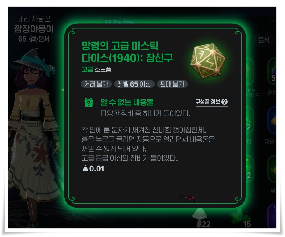 | 20층 | 4-5 | 레어 강화 재연소 촉매 3개, 망령의 고급 미스틱 다이스(1940): 방어구 1개 |