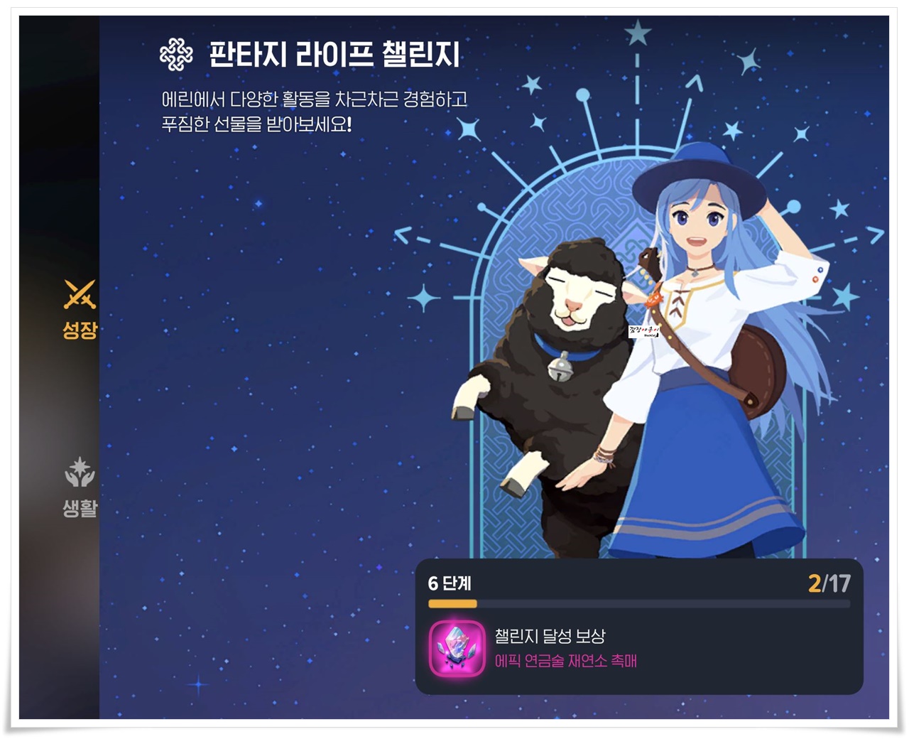 와이프가 저보다 회사생활이 더 바빠 게임 할 시간이 별로 없어 퀘스트 위주로 랩업만 하고 있고 다른건 손에 대질 않았기에 우선적으로 '판타지 라이프 챌린지' 위주로 게임을 진행하라고 조언해 줬습니다.