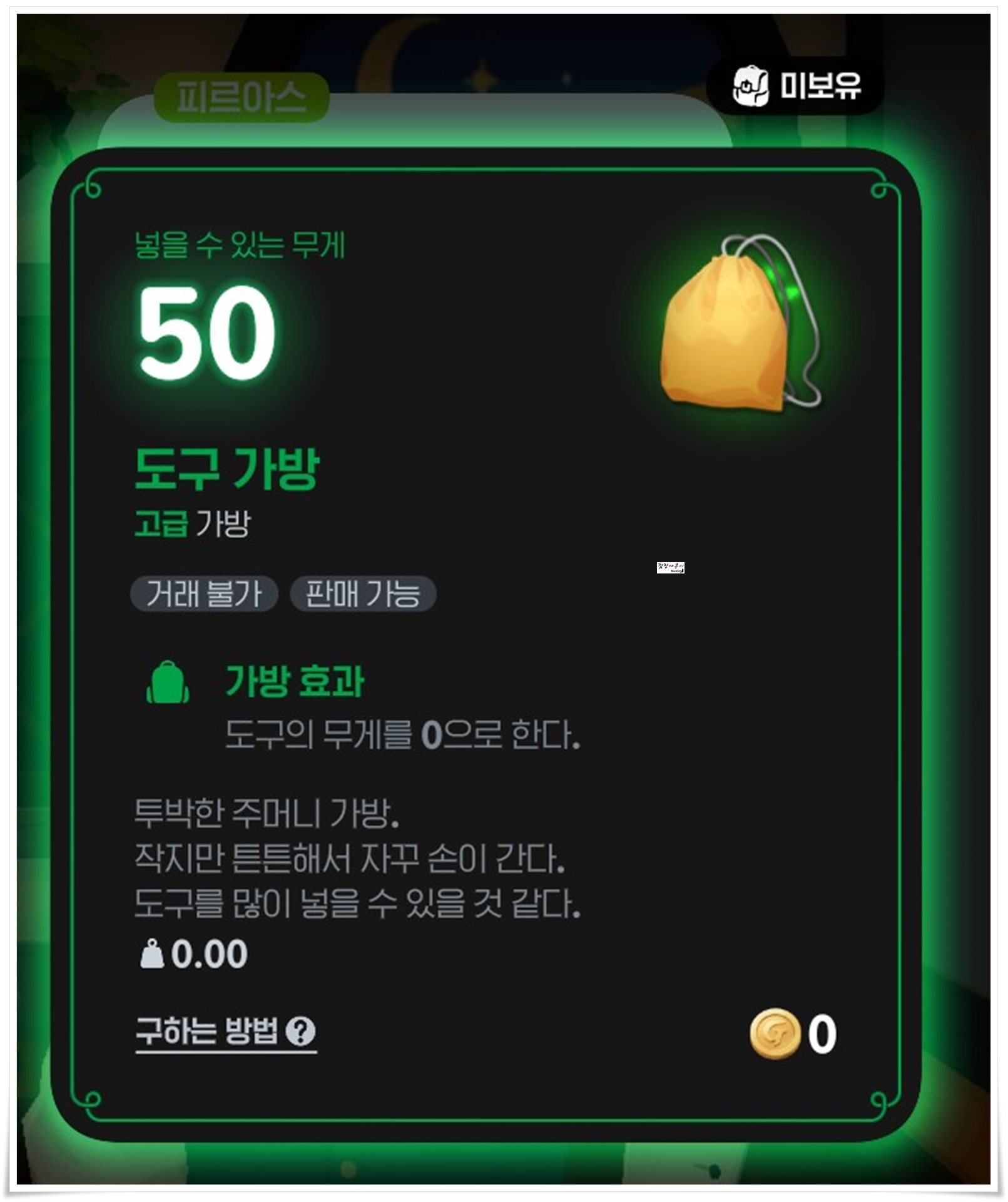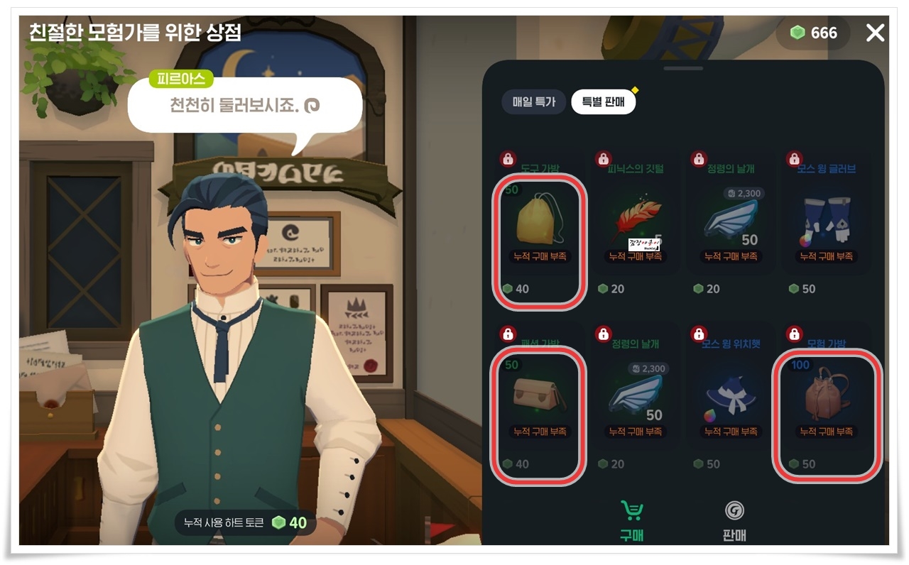 도구가방의 경우에는 도구의 무게를 0으로 만들어 주는 효과가 있으며 하트토큰 누적 사용량이 60개가 넘어야 구매가 가능했습니다.