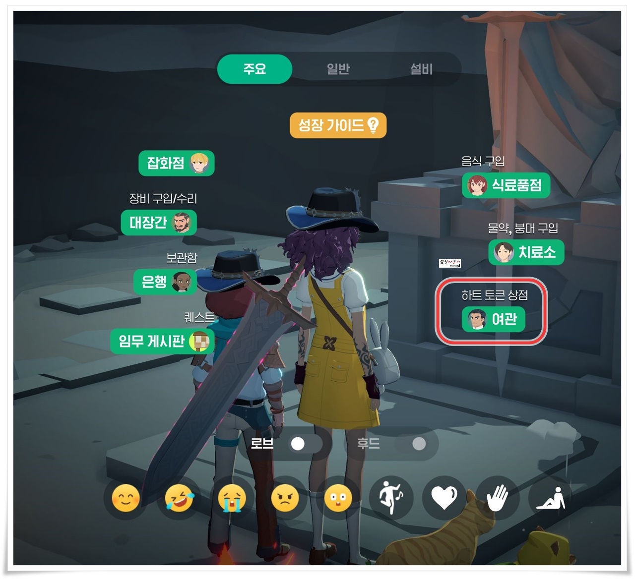 캐릭터를 클릭하시면 근처 NPC의 위치를 알려주는 네비게이션이 나타납니다. 캐릭터 클릭 후 하트토큰 상점이 있는 여관으로 이동을 합니다.