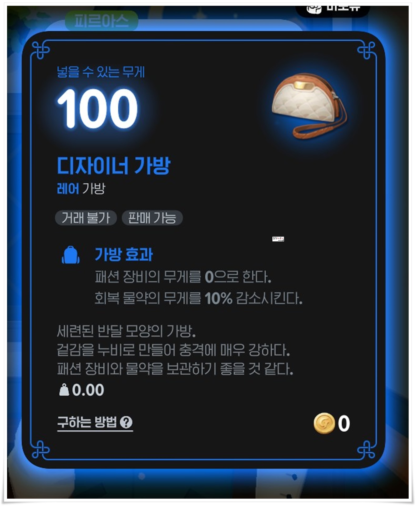 디자이너가방의 경우에는 패션장비의 무게를 0으로 만들어 주고 회복물약의 무게를 10% 감소시켜주는 효과가 있으며 하트토큰의 누적사용량이 570개를 넘어야 구매가 가능했습니다.
