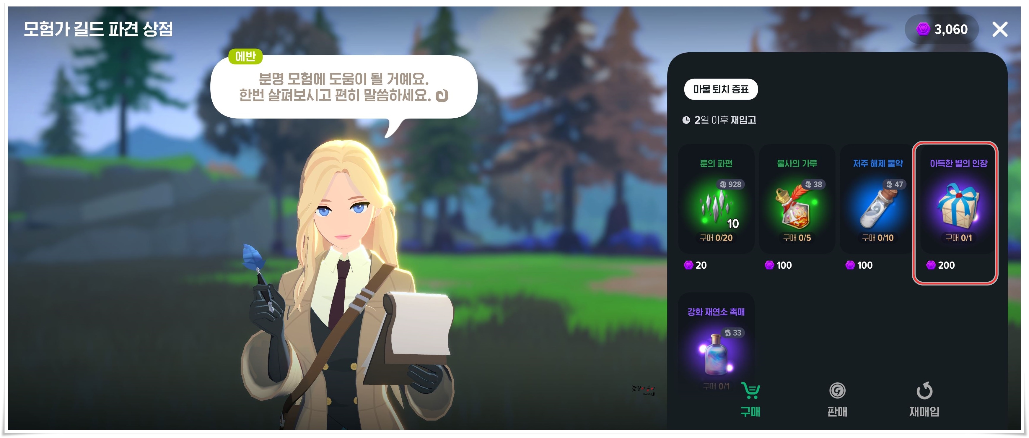 또한, 필드 보스를 처치하거나 던전, 퀘스트를 진행하다 보면 '마물 퇴치 증표'를 얻게 됩니다. 필드보스와의 전투가 끝난 뒤 보스가 있던 자리에 나타나는 NPC에반을 통해 200개의 '마물 퇴치 증표'를 주고 '아득한 별의 인장' 상자로 교환 하실 수 있습니다.