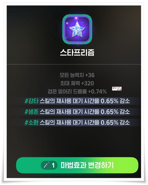 | 스타프리즘 | 트리플쿼츠 + 다크라이트 | 모든 능력치 + 체력 + 검은 덩어리 드랍률 |