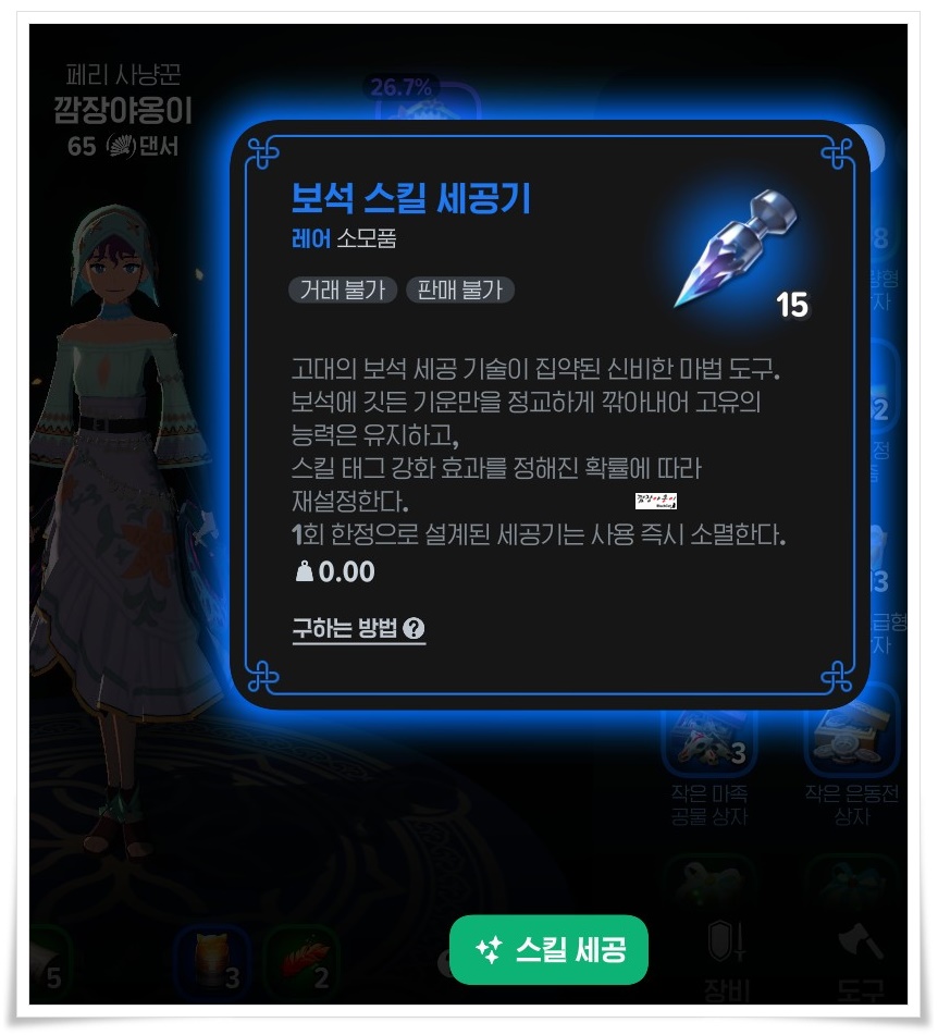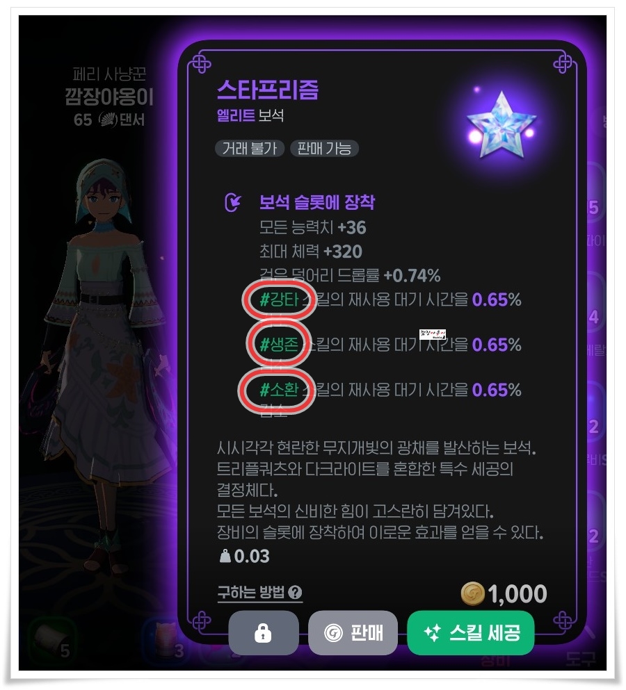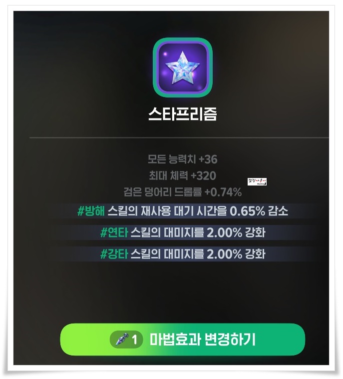 이럴경우 보석 스킬 세공기 아이템을 이용해 스타프리즘의 스킬 태그를 변경하실 수 있습니다.