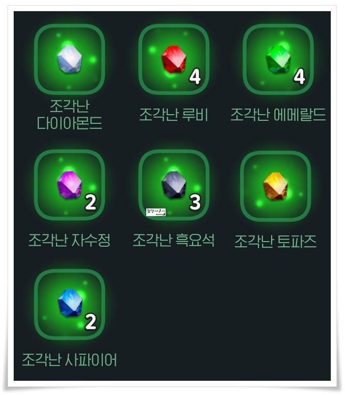 앞서 보석의 종류에 대해 이야기를 했었죠. 위 조합식을 보시면 조각난/ 투박한 처럼 별칭이 붙어 있지 않은 순수한 보석의 이름으로 되어 있습니다.