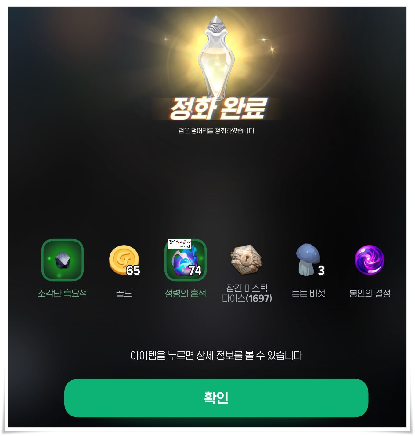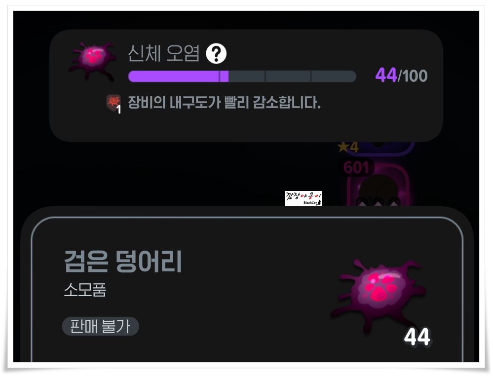 다른 스탯들은 모두 어떤건지 감이 오는데 '검은 덩어리'가 무엇인지 모르시는 분들이 있으시겠죠? 검은 덩어리란 마족이나 난폭한 동물 등 몬스터와 전투 후 나오는 물질로 많이 쌓이면 장비를 부식시켜 내구도가 빨리 닳도록 합니다. 마을에서 휴식을 취하거나 성수를 이용해 정화할 수 있으며 기본적으로 30분마다 20개씩 감소해 잠긴 미스틱 다이스, 골드, 정령의 흔적, 룬의 파편 등 여러가지 아이템을 보상으로 얻을 수 있습니다.