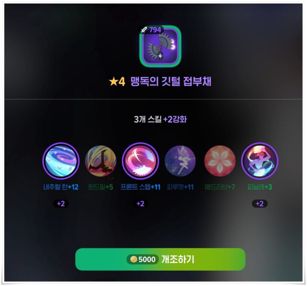 단, 이때 변경되는 스킬 강화는 랜덤으로 부여되기에 원하는 스킬이 오를때까지 재화를 소모해야 하므로 운빨이 중요합니다.