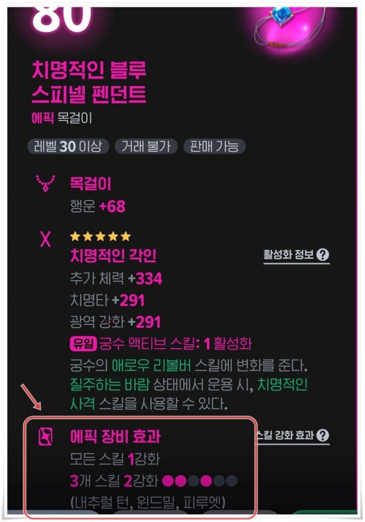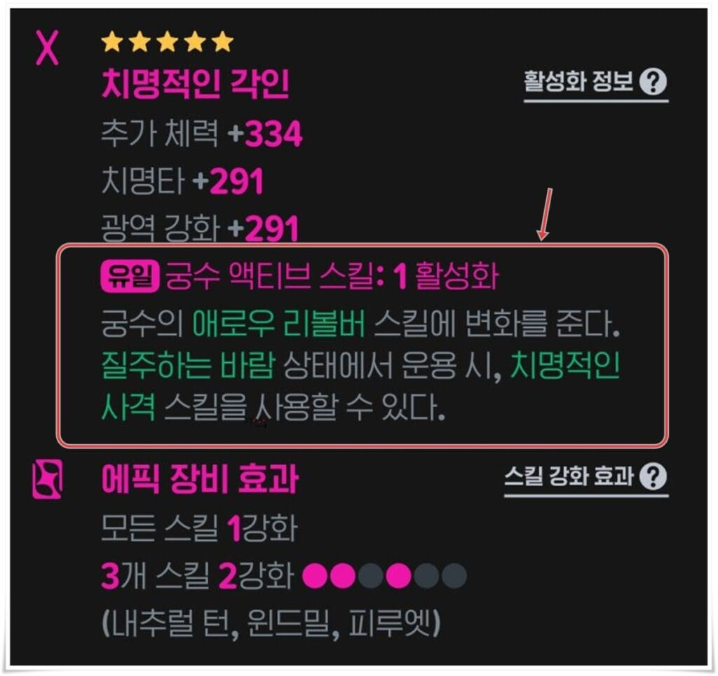 에픽 등급 이상의 룬에는 유일항목이 있습니다. 이 유일항목을 통해 클래스별 액티브 스킬을 올릴 수 있는데요.