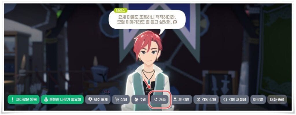 대장간 NPC에게 말을 걸면 '개조'라는 항목을 보실 수 있습니다. '개조'를 통해 아이템의 속성을 변화시킬 수 있습니다.