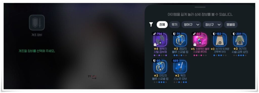 무기/장신구/보호구 등 고급 등급 이상 장비를 확인해 보시면 아이템에 장비 강화에 대한 내용을 확인 하실 수 있습니다.