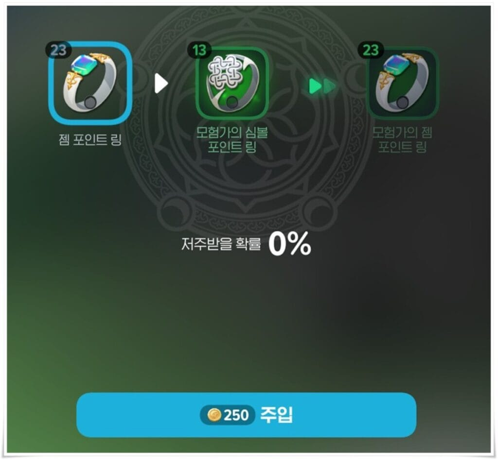 그런데 성공 확률이 40% 밖에 안되네요. 보석류를 모두 100% 확률로 승급하다 40%를 보니 불안불안 하네요.