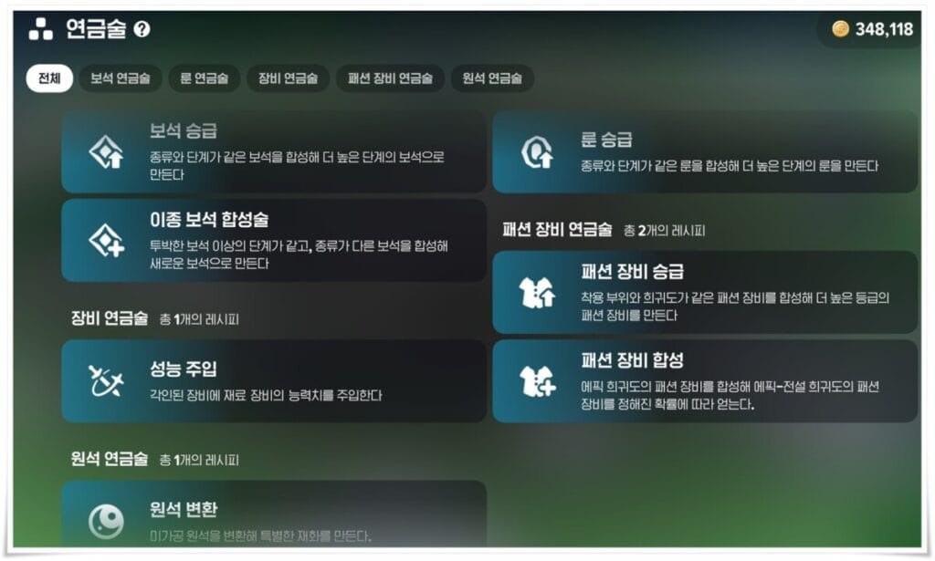 연금술 항목으로 들어오시면 보석 승급/ 이종 보석 합성술/ 성능 주입/ 원석 변환/ 룬 승급/ 패션 장비 승급/ 패션 장비 합성 등이 있습니다.