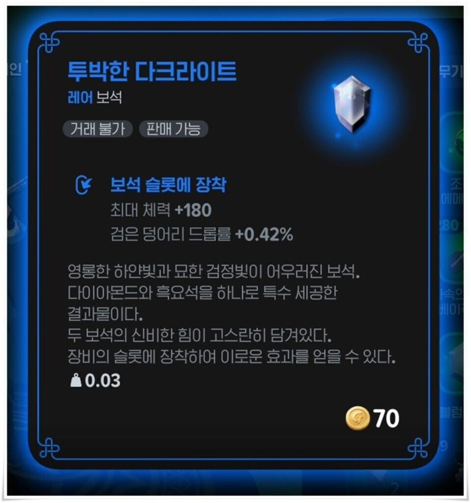 '투박한 다크라이트'가 가지고 있던 최대 체력 +180/ 검은 덩어리 드롭율 0.42%와 '투박한 트리플쿼츠'가 가지고 있던 모든 능력치 +22를 그대로 가져와서 합쳐졌네요.