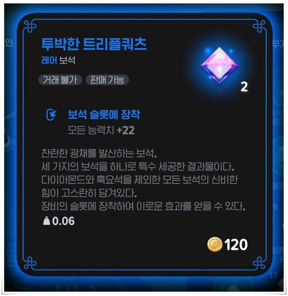 파란색 등급 '투박한 다크라이트'와 '투박한 트리플쿼츠'를 이용해 이종 보석 합성술을 해 볼텐데요.