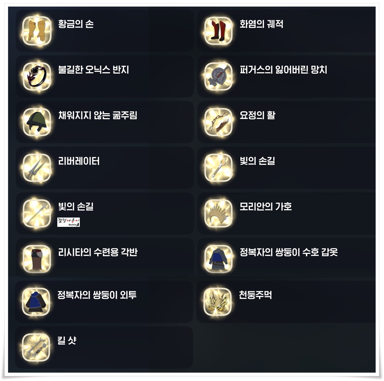 아이템명 | 가라앉은 유적 | 무너진 제단 | 파멸의 전당 |