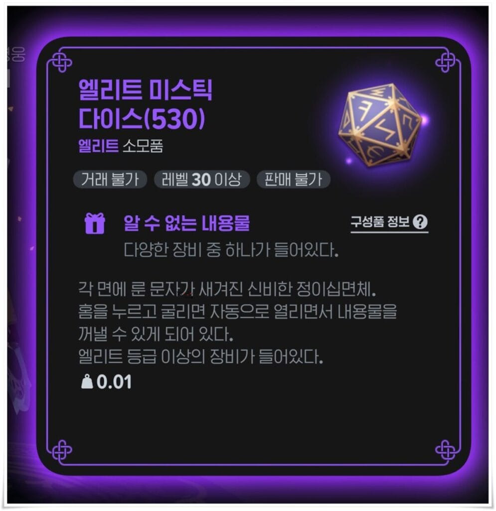 미스틱 다이스를 개봉하시면 에픽부터 엘리트, 레어, 고급, 일반 등급의 아이템을 랜덤으로 하나 얻을 수 있습니다.