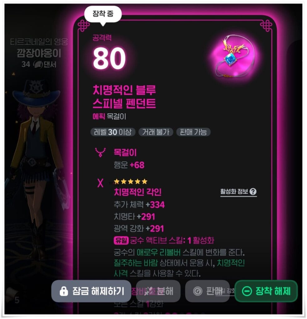 처음으로 에픽등급의 아이템을 얻었네요. 장신구에 궁수 스킬 활성화가 붙어 살짝 아쉽긴 하지만 그래도 처음 획득한 등급이라 바로 착용해서 잘 사용중이랍니다.
