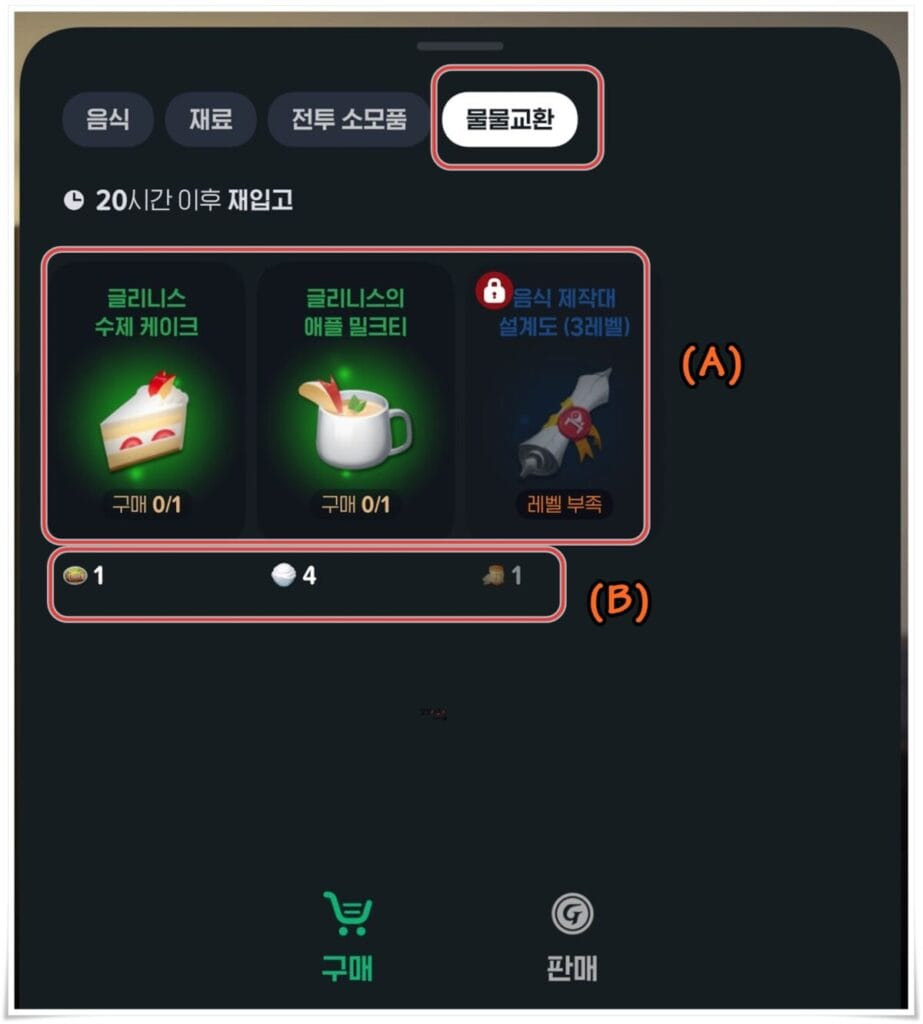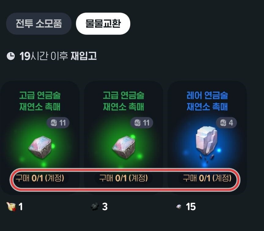 그 아래 보면 재입고 시간이 나와있죠? 24시간 간격으로 초기화 된다고 보시면 됩니다. 이제 원하는 아이템을 클릭 후 가지고 온 재료와 물물교환을 해주시면 됩니다. 단, 일부는 시간에 상관없이 계정별로 1회만 구매할 수 있는 아이템도 있답니다.
