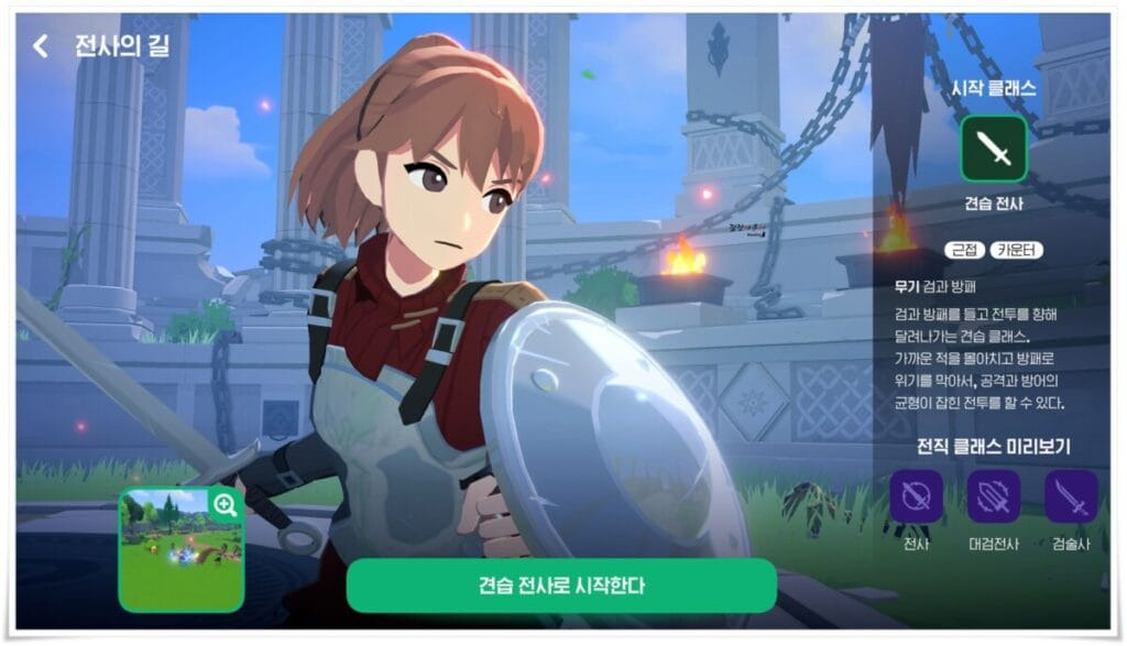 검과 방패를 들고 전투를 향해 달려가는 견습 클래스로 가까운 적을 몰아치고 방패로 위기를 막아서 공격과 방어의 균형이 잡힌 전투를 할 수 있습니다.