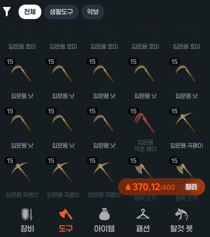 내구도가 모두 사용되더라도 인벤에 다른 도구가 충분히 있다면 채집은 멈추지 않고 계속 이어집니다.