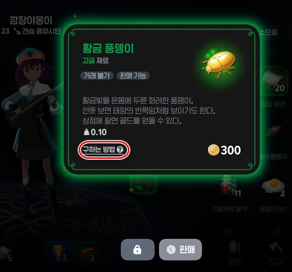 인벤에서 황금 풍뎅이를 선택을 해보세요. 물론 황금 풍뎅이가 아니어도 됩니다. 다른 재료를 선택하셔도 동일하게 확인 할 수 있습니다.