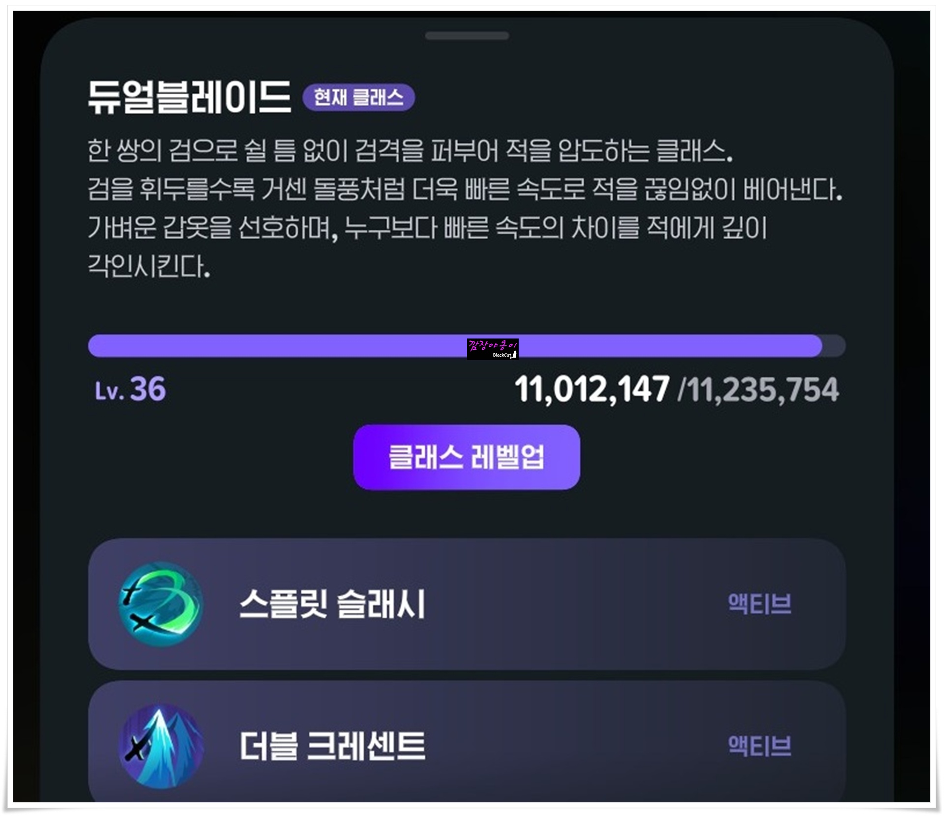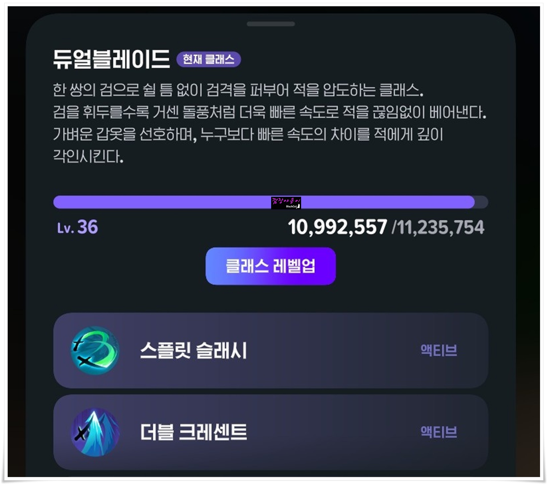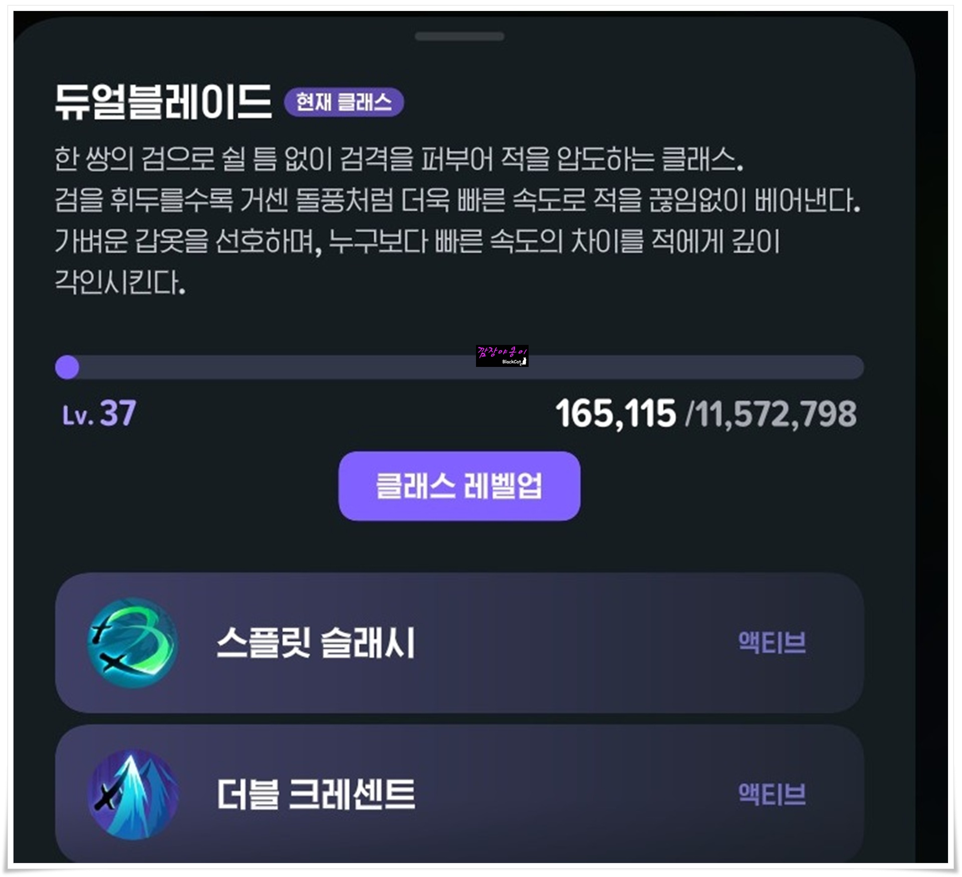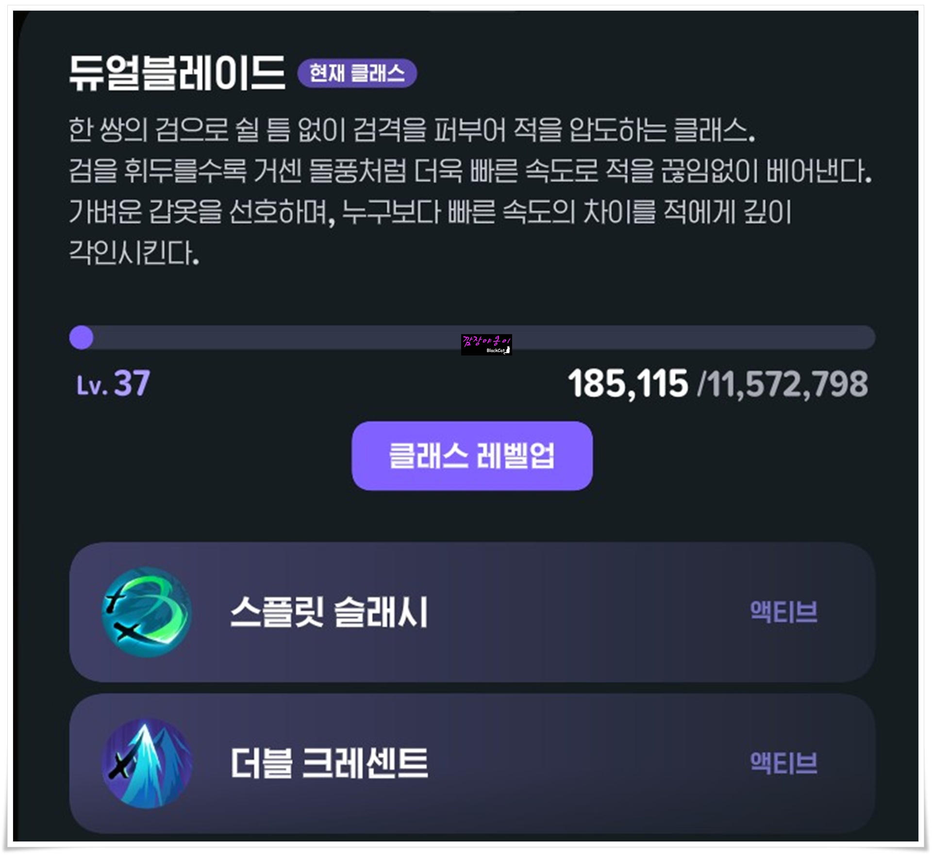 제가 키우고 있는 2개의 캐릭터를 예로 들어보면 음유시인 댄서는 64렙/ 클래스 레벨 45렙이고 도적 듀얼블레이드는 53렙/ 클래스 레벨 37렙입니다.