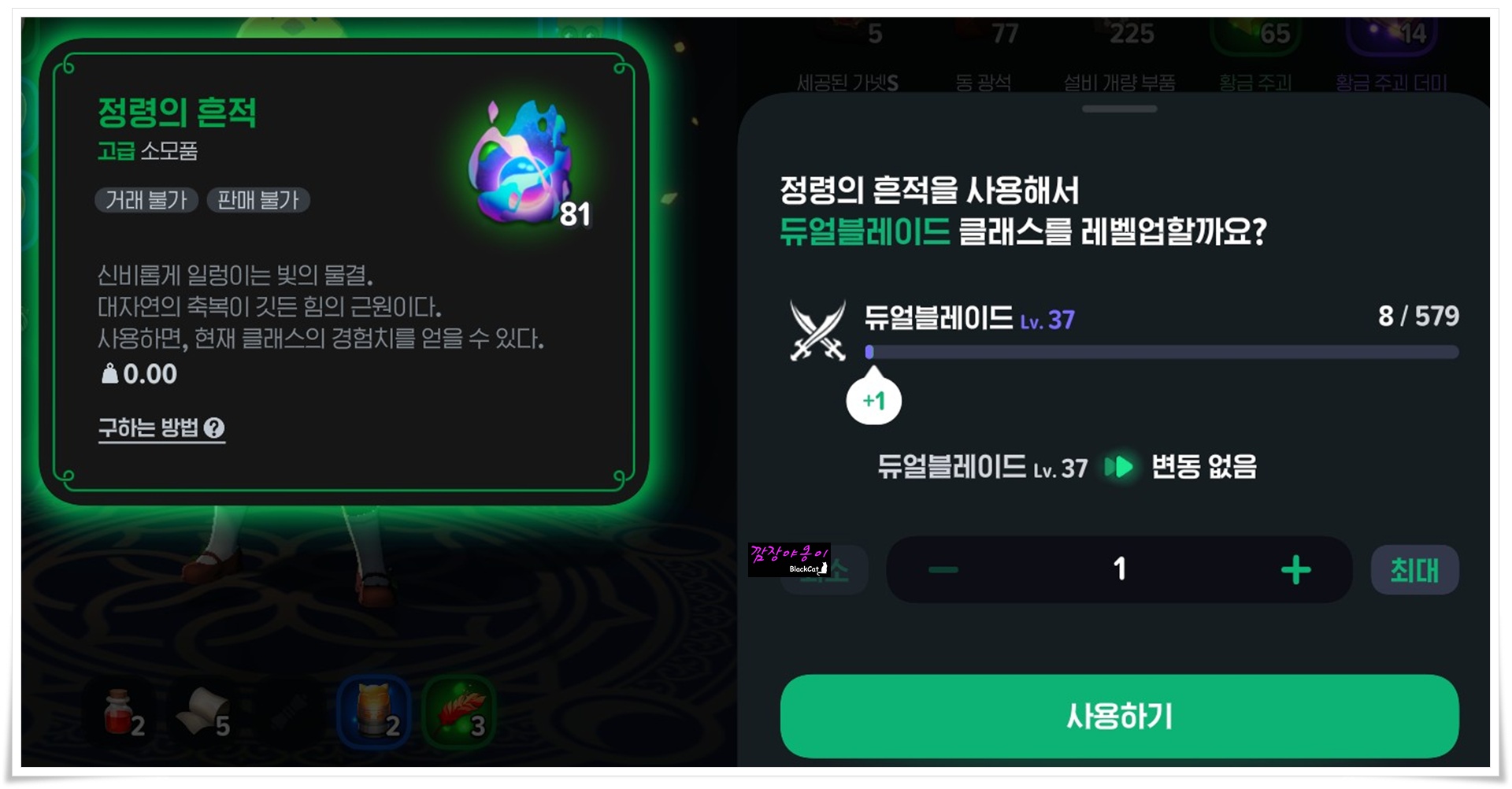 즉, 클래스 LV을 올리기 위해선 몬스터를 처치하거나 던전을 돌거나 여신의 뜰 퀘스트를 진행하시면 되고 아이템을 이용해 올리실 분들은 분해로 얻을 수 있는 정령의 흔적을 사용하시면 됩니다.