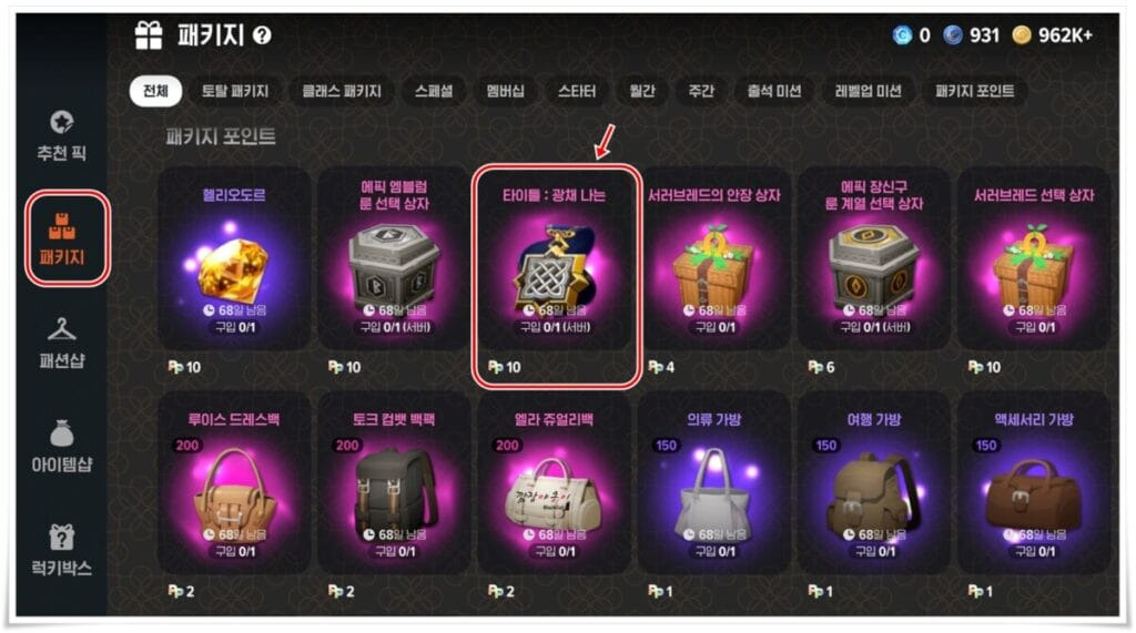 거래소에 가셔서 '아르카나'를 검색하시면 '미스틱 아르카나 토탈 패키지'가 나옵니다. 데카를 이용해 구매할 수 있는데 25.06.19 오전6시까지만 사용할 수 있는 아이템이며 이 패키지를 통해 '반짝이는'이라는 타이틀을 획득 하실 수 있습니다.