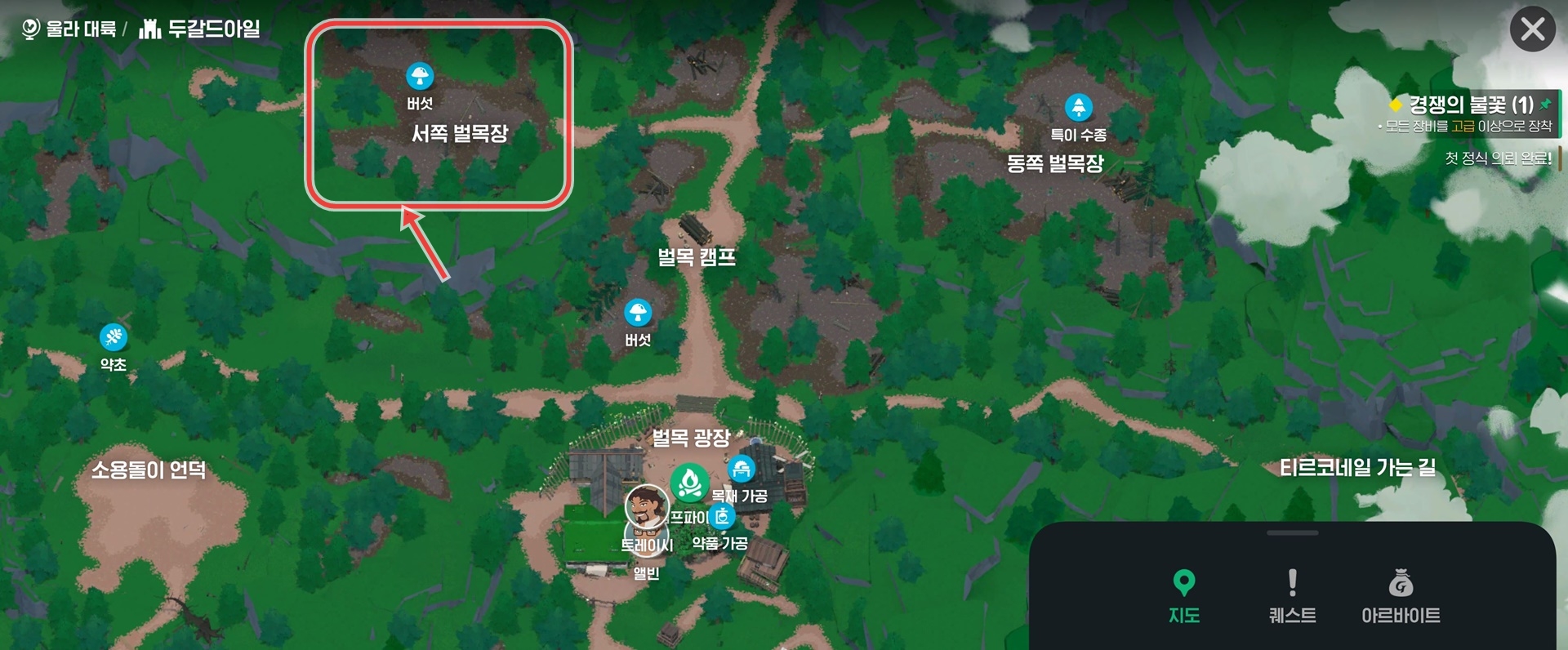 두갈드아일로 오셨다면 이제 서쪽 벌목장으로 이동을 합니다. PC로 게임을 진행 중이시라면 지도에 마우스 우클릭을 하시면 이동하기가 가능합니다.