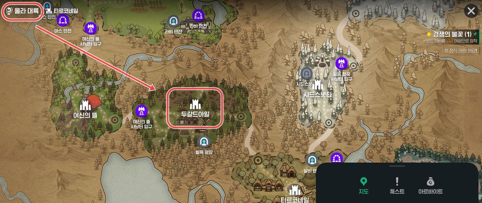 지도에서 '울라대륙'을 선택한 뒤 '두갈드아일'을 선택하세요.