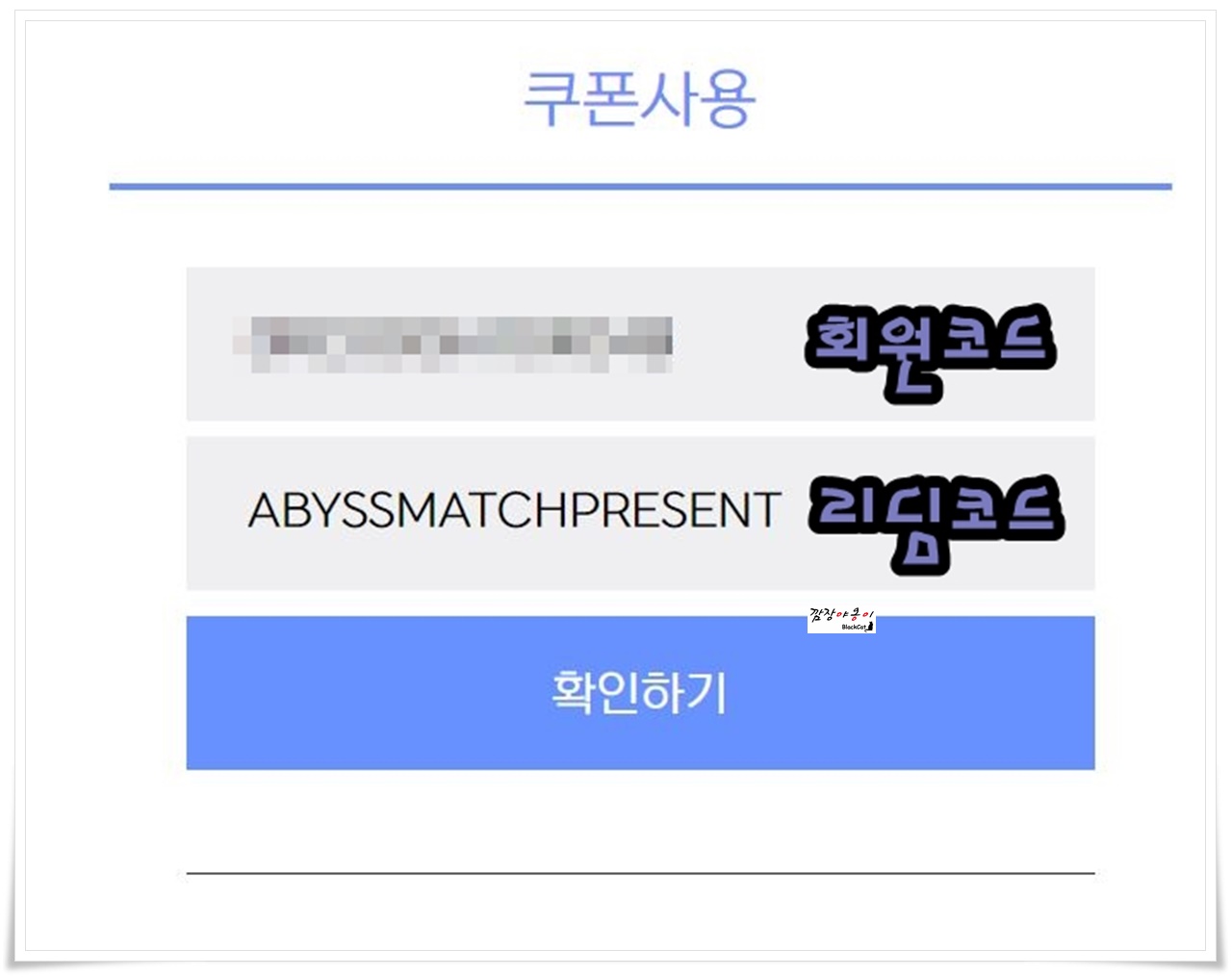 앞서 회원코드를 복사했던 그곳입니다. 오른쪽 하단에 보시면 '쿠폰등록'이라는 배너가 있을텐데요. 이 경우에도 홈페이지 등록방식과 동일하게 회원코드와 쿠폰코드를 모두 기재해야 합니다.