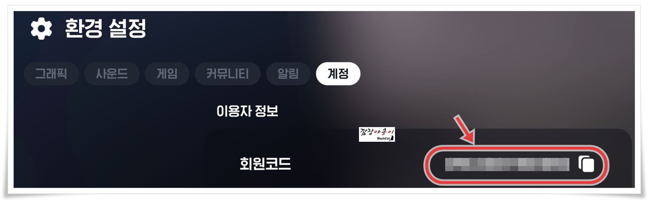회원코드는 게임내 "우측상단 지고 옆 점점점(≡) → 환경설정 → 계정"에 있으며 일일이 긴 회원코드를 외우거나 보면서 타이핑 치지 않아도 옆에 있는 복사버튼을 눌르시면 손쉽게 코드를 복사하실 수 있습니다.