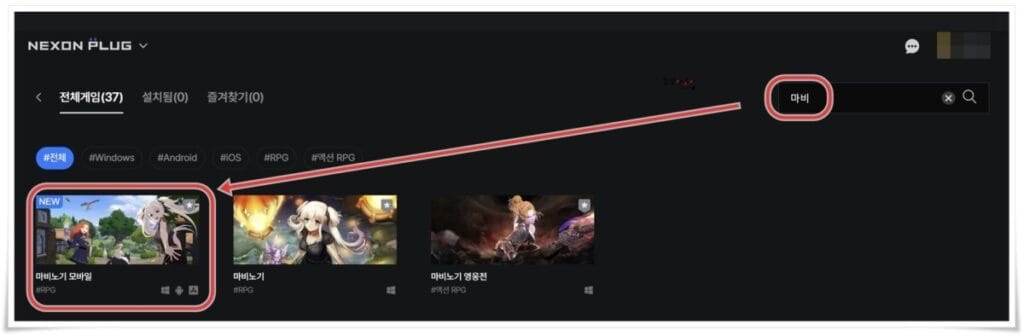 우측 상단의 검색을 통해 마비노기 모바일을 찾아주세요.