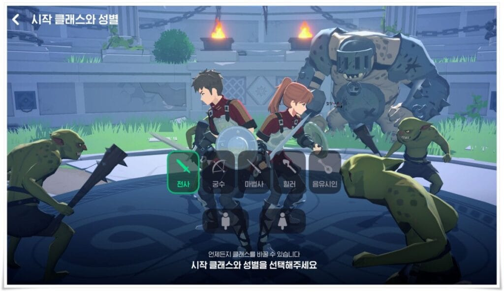 전사/ 궁수/ 마법사/ 힐러/ 음유시인 그리고 남성/ 여성 중 마음에 드는 것으로 선택을 하시면 됩니다.