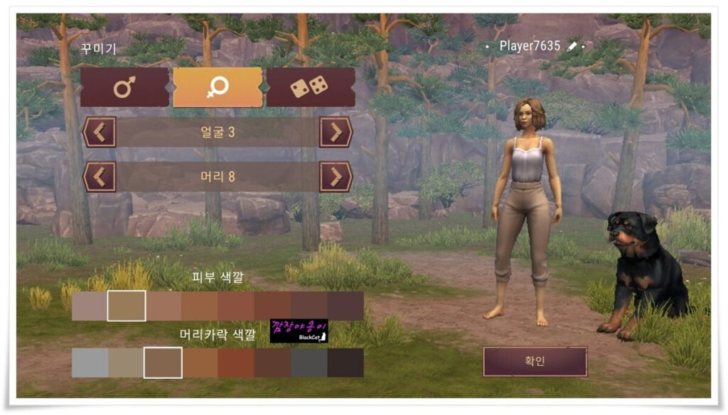 게임을 실행하면 캐릭터를 생성해야 합니다. 남/여자를 선택 후 얼굴모양/머리모양/피부 색상/머리카락 색상을 선택하시면 되는데 저 같은 경우는 주사위 모양의 랜덤을 클릭했답니다.