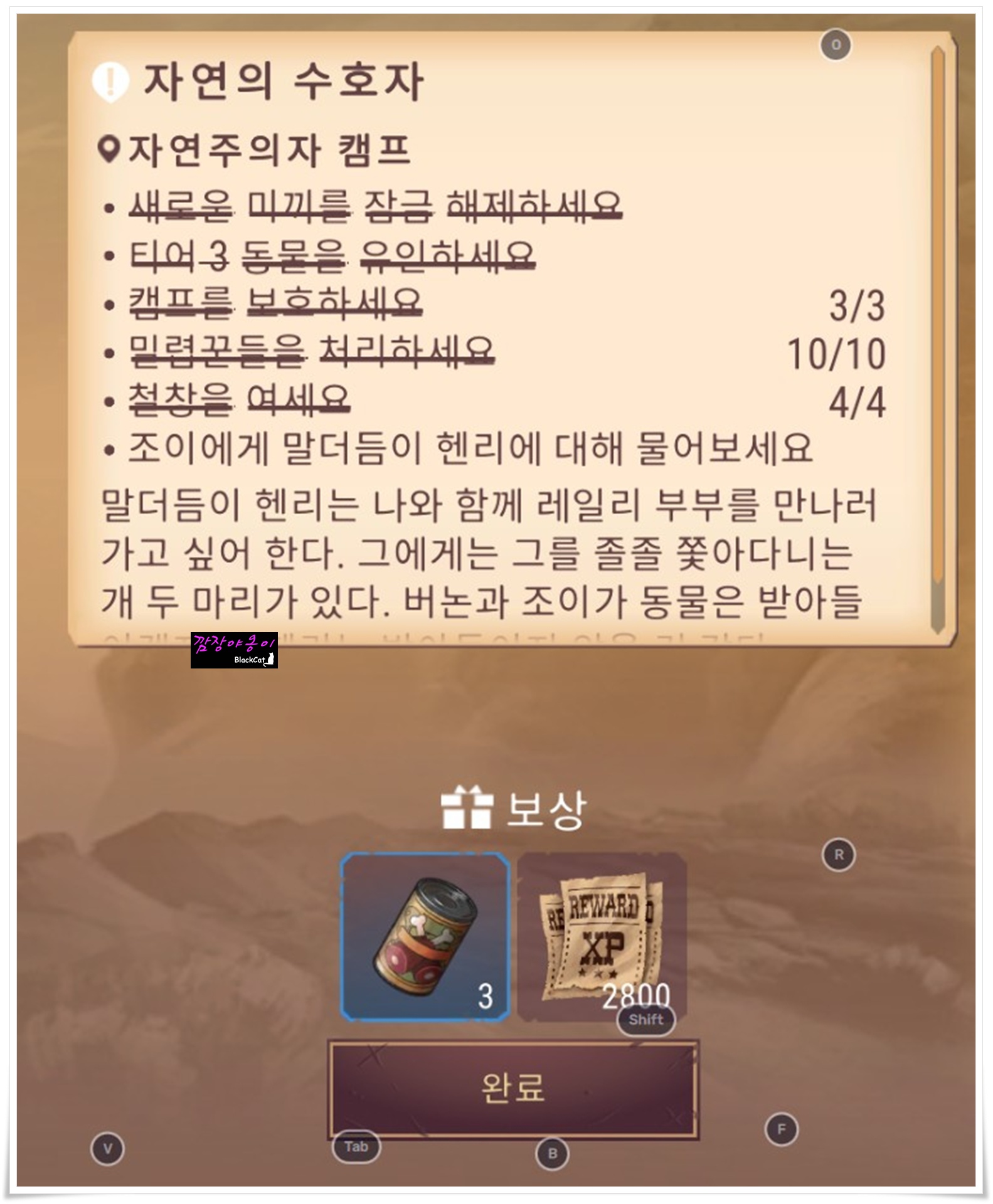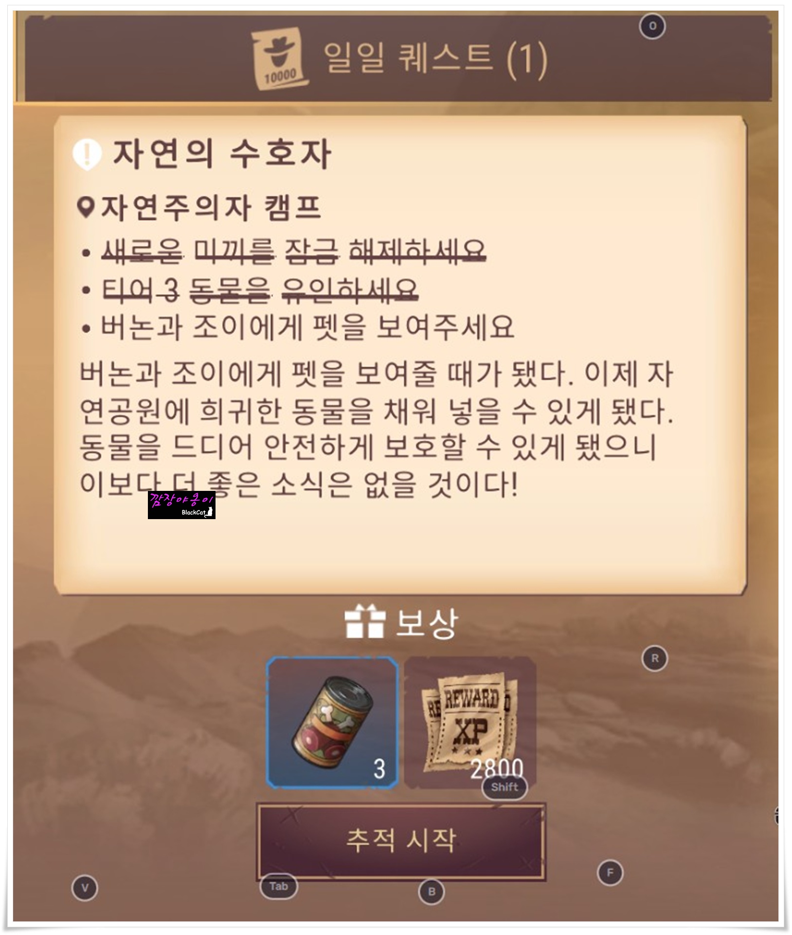 자연주의자 캠프에서 진행할 '자연의 수호자'라는 퀘스트를 얻으셨나요? 이걸로 진행을 하셔야 합니다. 이 퀘스트를 진행하기 위해선 우선적으로 3가지 선행 되어야 할 작업이 있습니다.