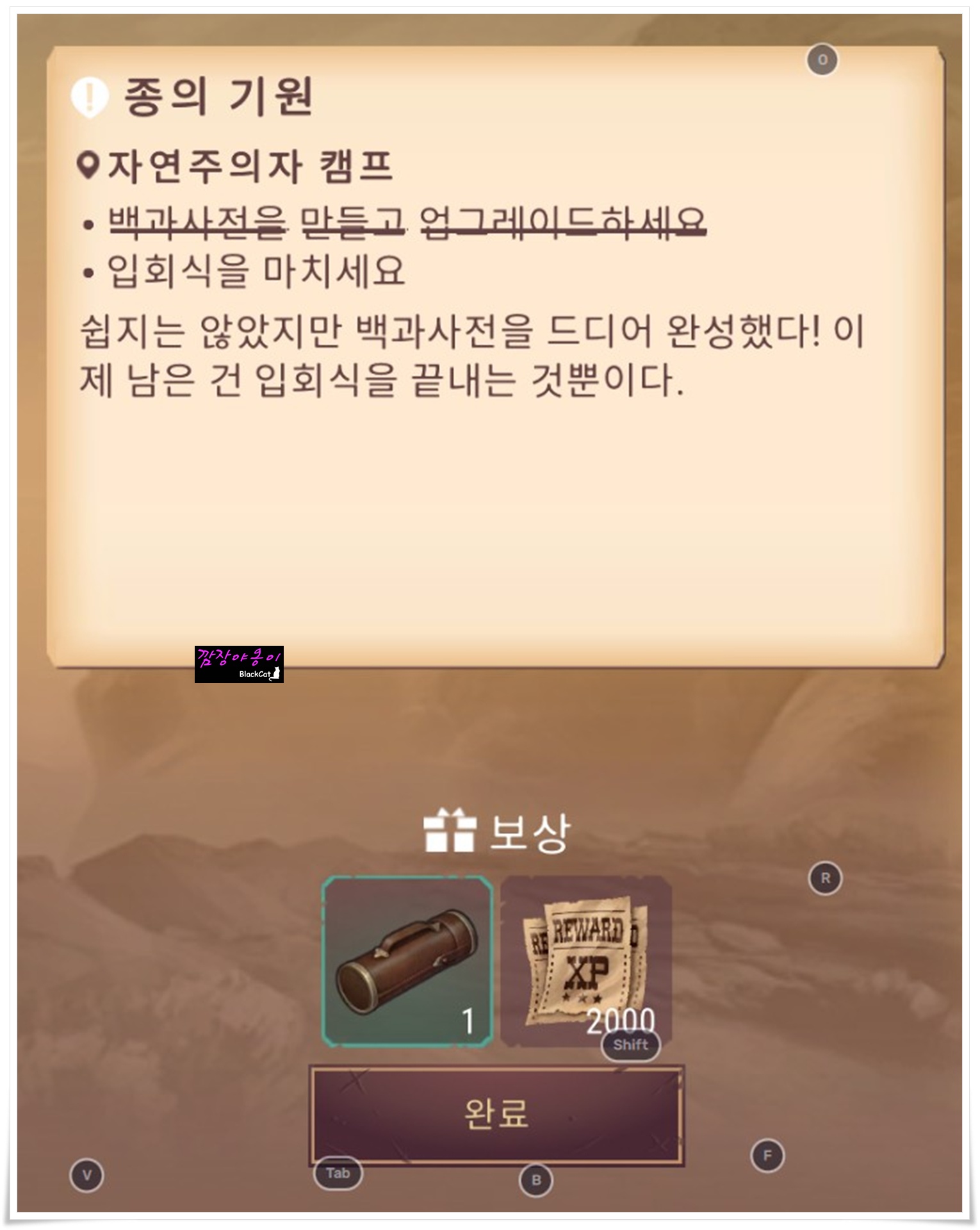 소굴에서 구출한 말더듬이 헨리와 함께 캠프로 되돌아가면 입회식을 하게 됩니다. 여기까지 진행하셨으면 이제 더 이상 함께한 3티어 펫은 필요가 없으니 버논에게 줘버리고 돌아오셔도 됩니다.