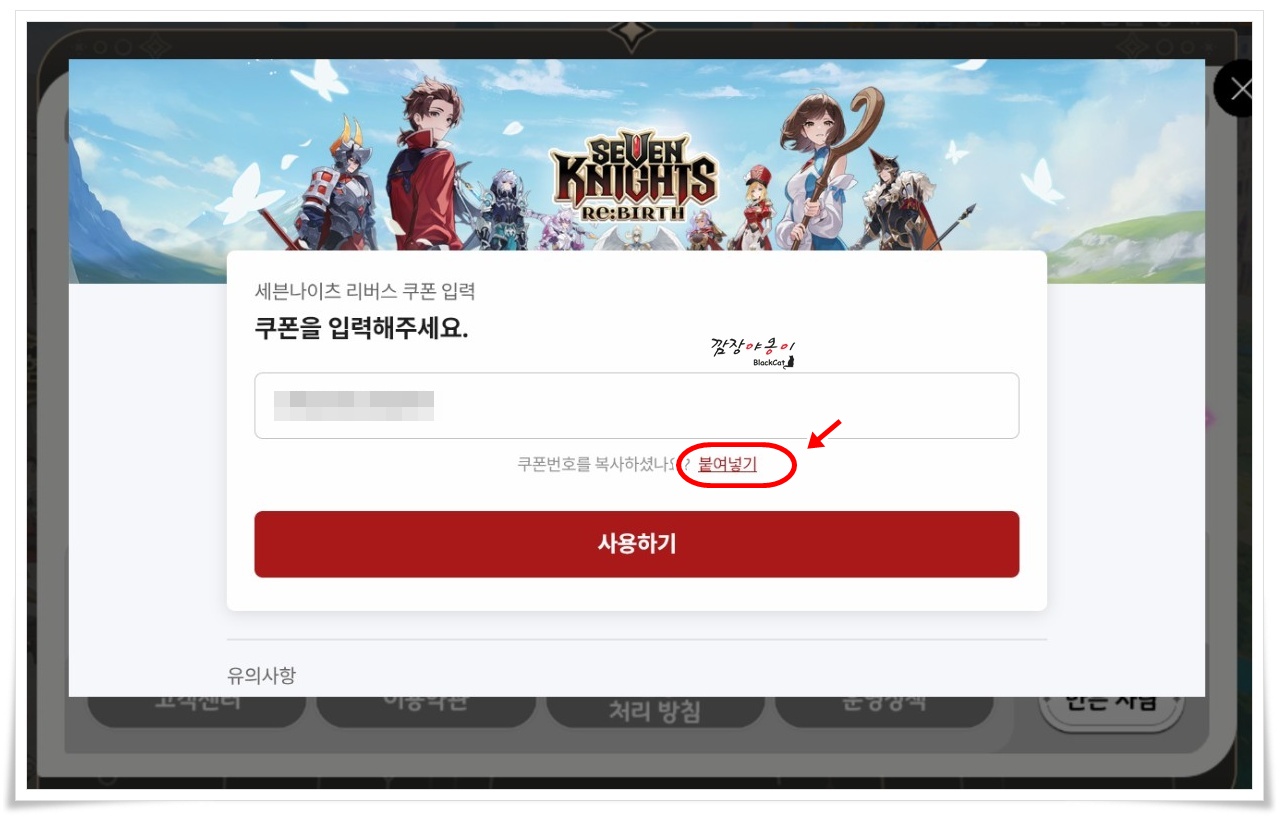 아래 올려놓은 쿠폰을 복사하셔서 넣으시면 선물을 받으실 수 있는데요. 쿠폰 복사 후 일반적으로 하는 방법으로 쿠폰번호 붙여넣기가 안된다면 위 사진에 표기해둔 붙여넣기 버튼을 클릭하시면 복사해 둔 번호가 자동입력이 됩니다.